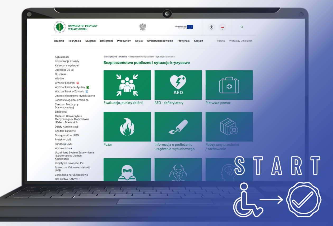 W ramach projektu „START – poprawa dostępności Uniwersytetu Medycznego w Białymstoku” uruchomiona została nowa podstrona internetowa poświęcona bezpieczeństwu publicznemu oraz zasadom postępowania w sytuacjach kryzysowych w UMB: https://www.umb.edu.pl/bezpieczenstwo. To ważne narzędzie informacyjne skierowane do całej społeczności akademickiej – studentów, doktorantów oraz pracowników Uczelni.