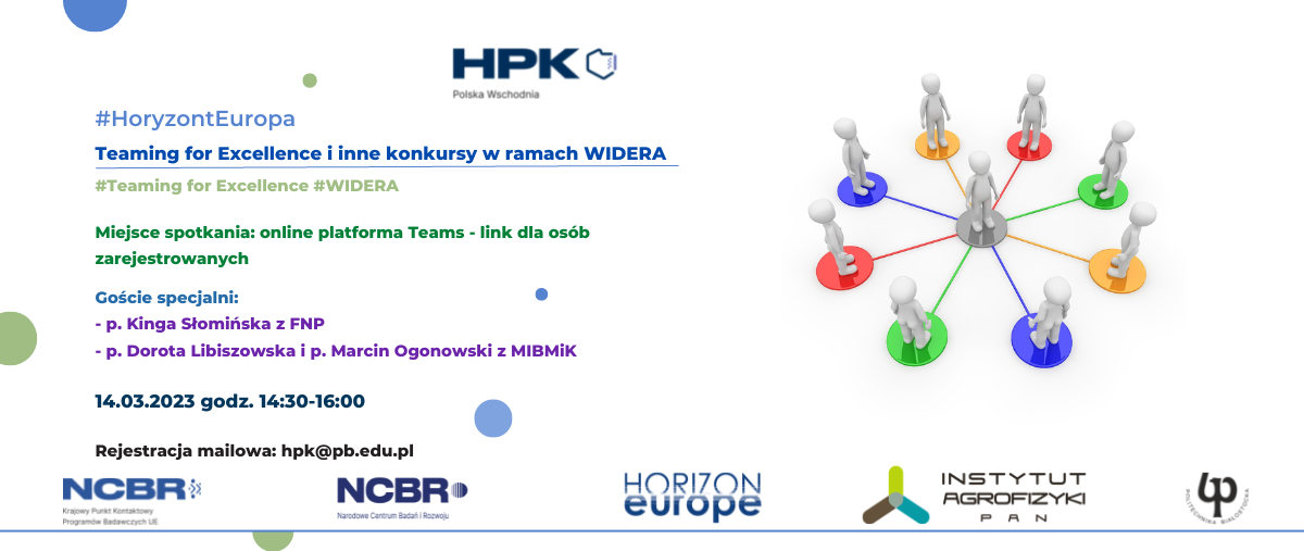 Horyzontalny Punkt Kontaktowy Polska Wschodnia serdecznie zaprasza na szkolenie online Teaming for Excellence i inne konkursy w ramach WIDERA, które odbędzie się we wtorek, 14.03.2023, w godzinach 14:30-16:00.