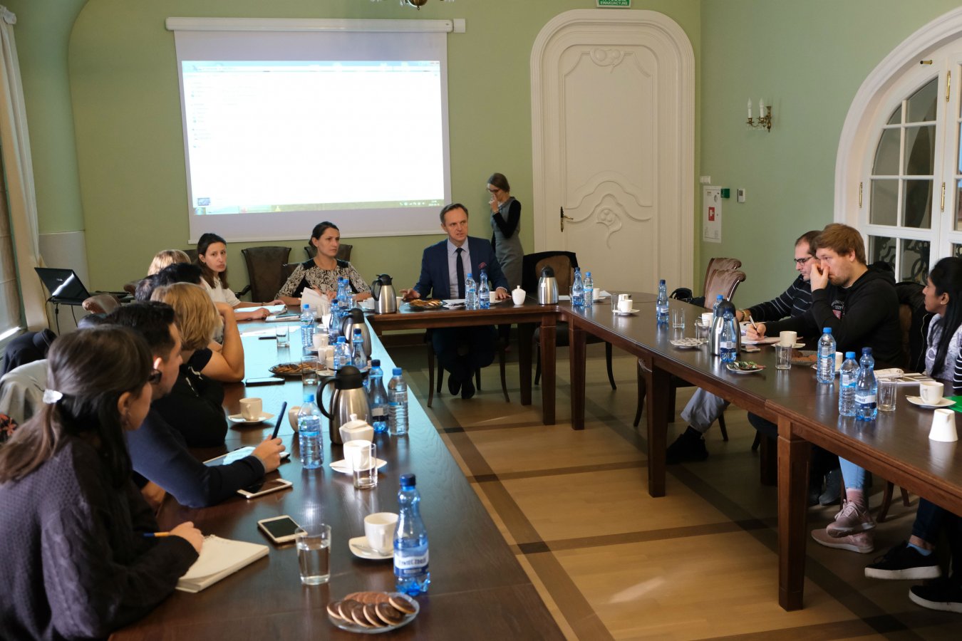 The last Brown Bag meeting of PhD students working on the ImPRESS project "International, interdisciplinary doctoral studies in the field of medical biology and biostatistics, training in research based on large-scale technologies and biostatistics, and support for young researchers through international and intersectoral mobility" took place at the Senate Hall on October 31, 2019. The Project coordinator, Vice-Rector for Science and Development Marcin Moniuszko with Vice-Dean of the College of Medical Sciences, associate professor Anna Moniuszko-Malinowska discussed the procedure and requirements concerning the 2019/2020 doctoral scholarship, proquality scholarship and Rector’s scholarship. Moreover, the PhD students were instructed how to fill in the survey assessing the scientific development of MUB employees and were informed on other current matters, such as forthcoming OHS training. Monthly meetings are a perfect opportunity to exchange experience and network for the ImPRESS PhD students and discuss the relevant matters with ImPRESS project management.