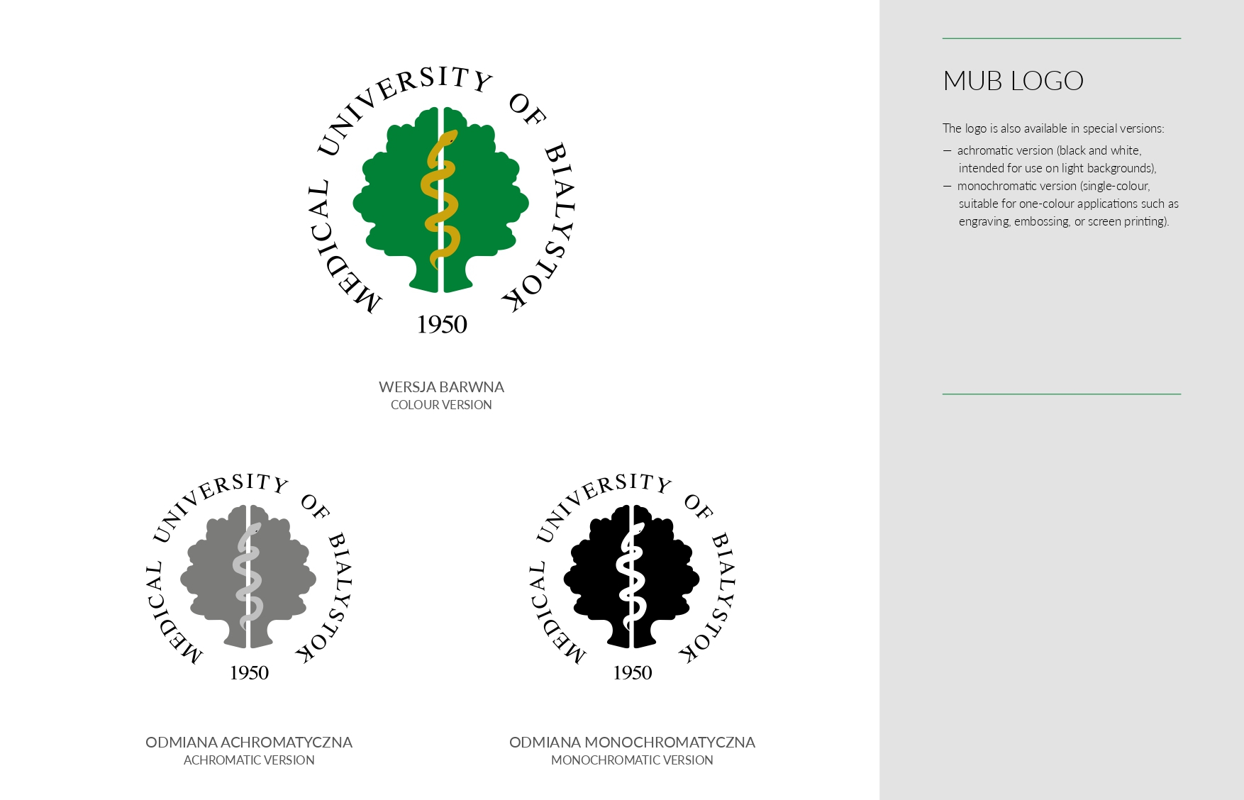 Adhering to the rules set out in the Brand Book ensures a coherent image of the Medical University of Bialystok, strengthening its recognisability, prestige, and visual communication in line with the University’s values and mission.
