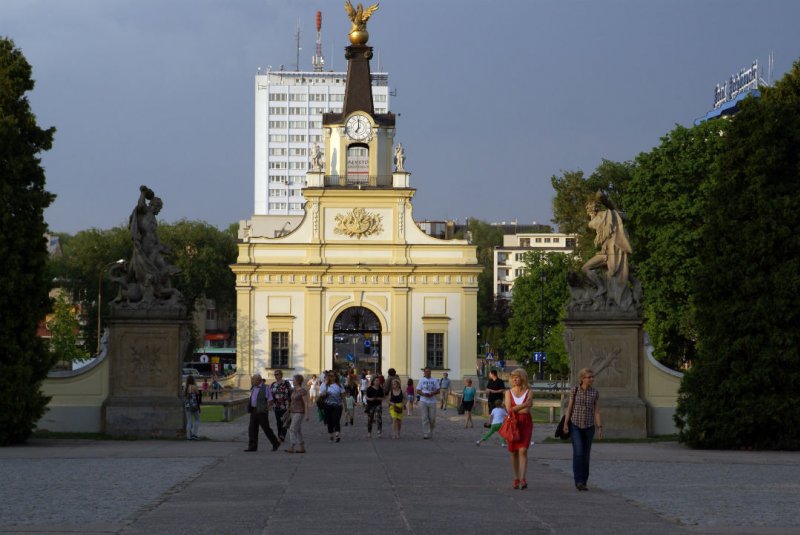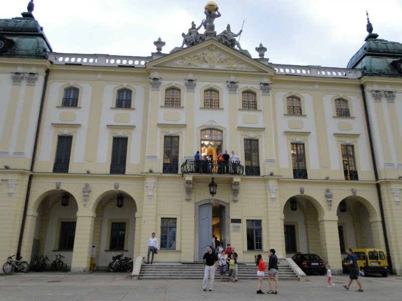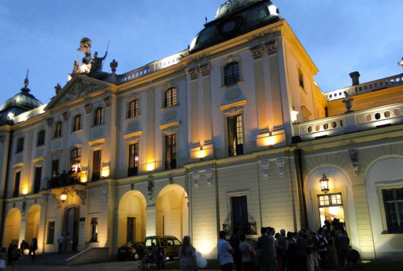 • Galerie. Pałac Branickich nocą. Widok od strony bramy wjazdowej. Logotyp 65 lat Uniwersytetu Medycznego w Białymstoku.