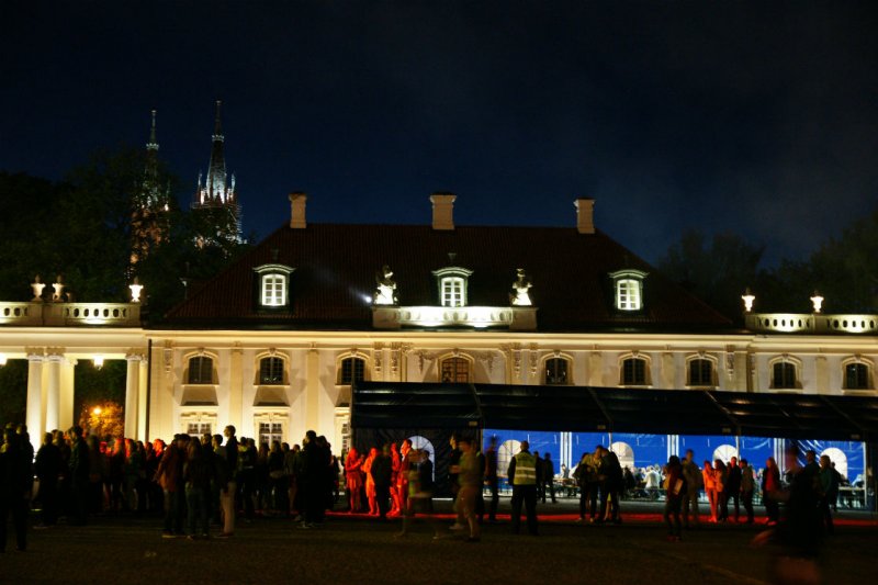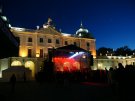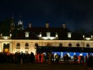 • Galerie. Pałac Branickich nocą. Widok od strony bramy wjazdowej. Logotyp 65 lat Uniwersytetu Medycznego w Białymstoku.