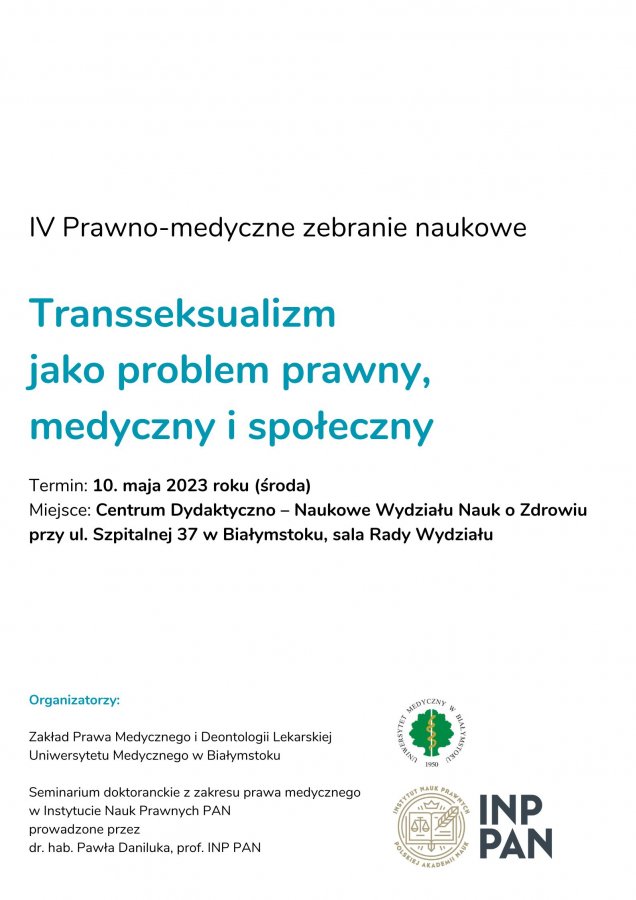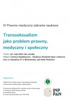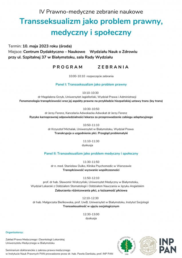 Prawno-medyczne zebranie naukowe to cykliczne spotkania, podczas których odbywa się prezentacja badań oraz dyskusja nad aktualnymi problemami prawa medycznego. Tematem aktualnego zebrania uczyniono medyczne, prawne i socjologiczne aspekty transseksualizmu i transpłciowości. Kwestie tożsamości płciowej są coraz częściej przedmiotem publicznej debaty. Podejmowany temat jest o tyle złożony i trudny, że wymaga merytorycznego omówienia wybranych kwestii i podjęcia próby odpowiedzi na niełatwe pytania podczas interdyscyplinarnej debaty łączącej prawników, medyków, socjologów i seksuologów.
