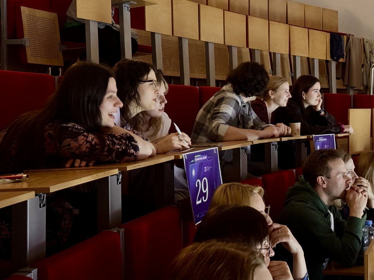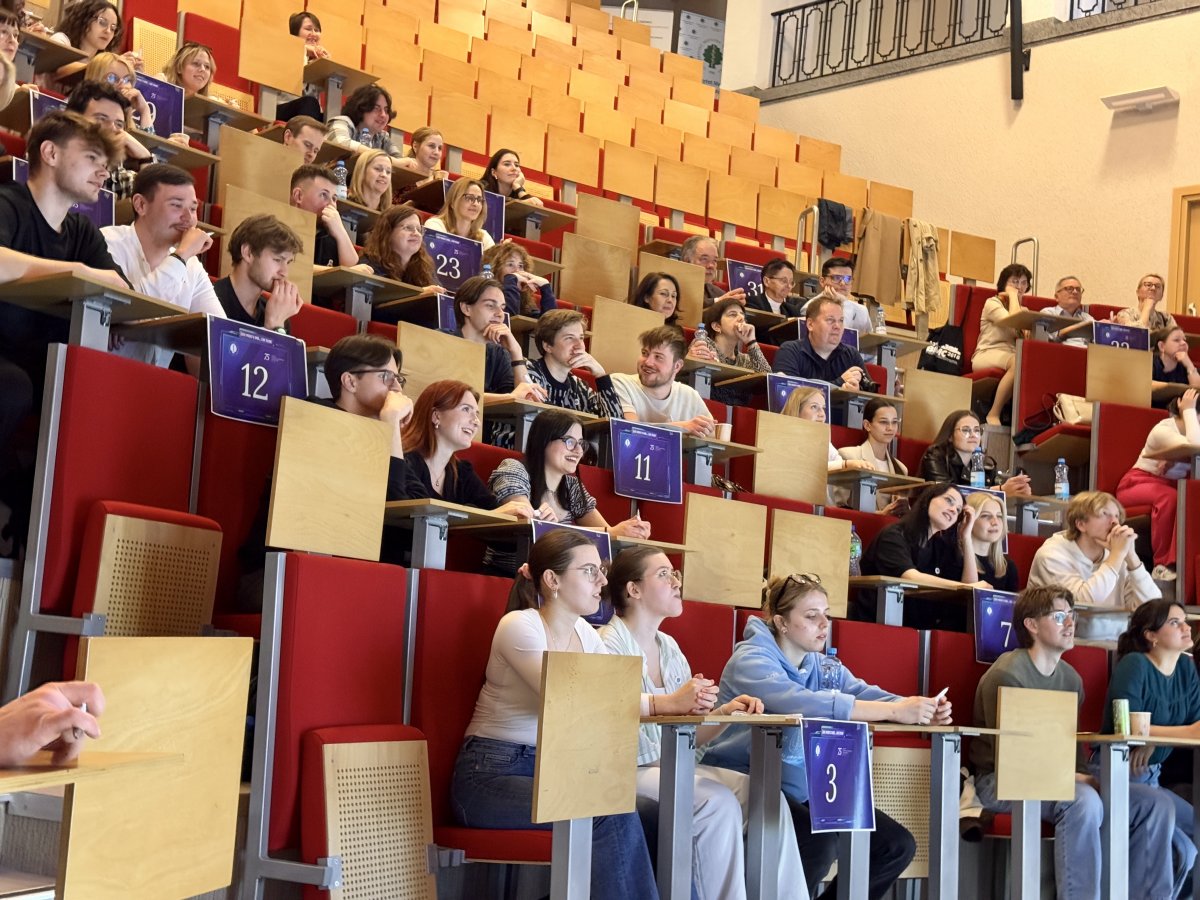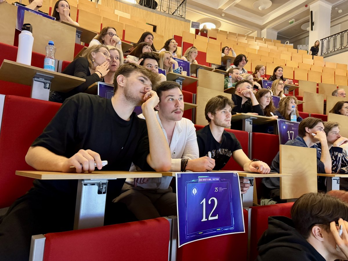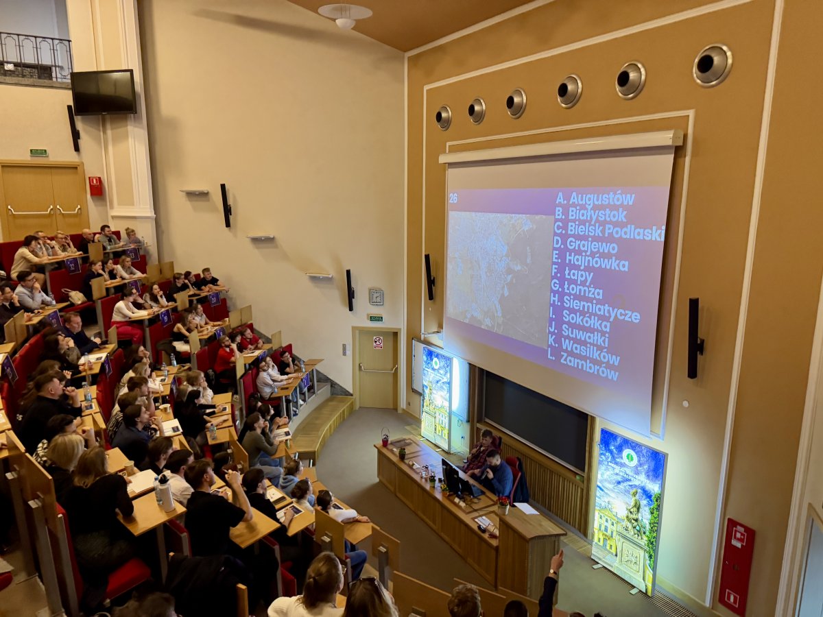 W czwartek 3 marca 2025 aula „Beczka” zamieniła się w pole intelektualnej rywalizacji. Aż 30 drużyn – złożonych ze studentów, wykładowców i pracowników UMB – stanęło do walki w quizie z wiedzy ogólnej oraz wiedzy o naszej Uczelni. Pytania były wymagające i podchwytliwe – średni wynik wyniósł 22,1 punktu na 50 możliwych. Dogrywkę o 2. miejsce rozstrzygnęło pytanie o liczbę pokoi w Hotelu Ritz w Białymstoku (poprawna odpowiedź: 50).