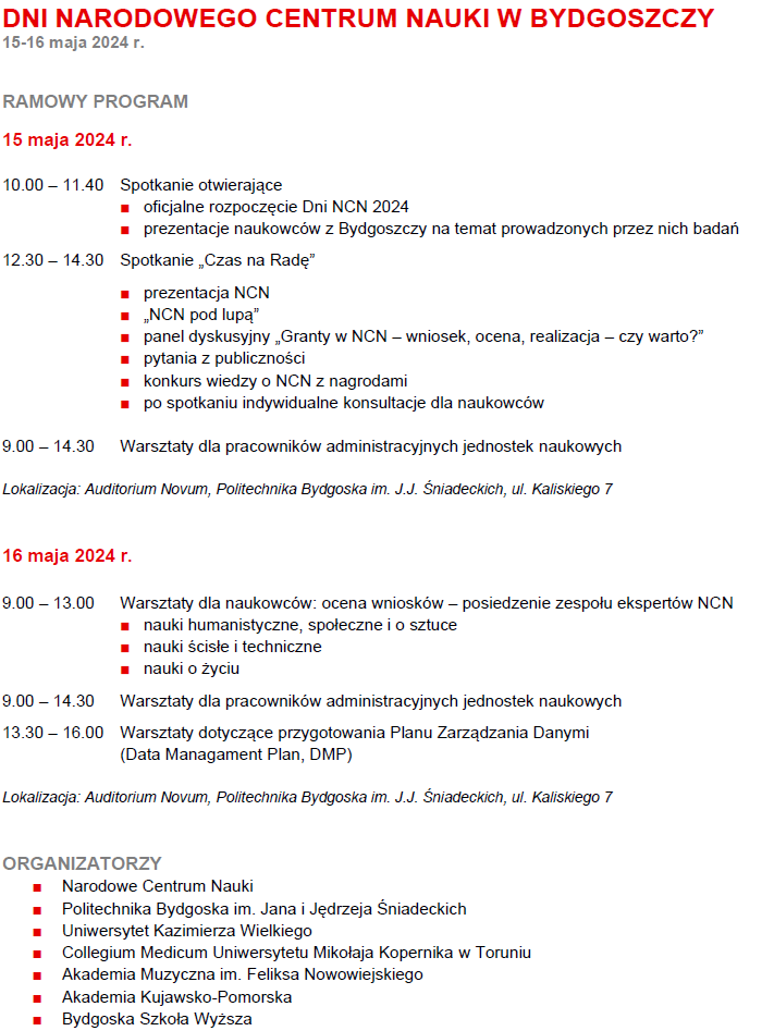 Gospodarzem tegorocznych Dni NCN jest Politechnika Bydgoska, we współpracy z Prezydentem Miasta Bydgoszczy oraz Uniwersytetem Kazimierza Wielkiego, Collegium Medicum Uniwersytetu Mikołaja Kopernika, Akademią Muzyczną im. Feliksa Nowowiejskiego, Akademią Kujawsko-Pomorską, Bydgoską Szkołą Wyższą, Wyższą Szkołą Gospodarki, Wyższą Szkołą Nauk o Zdrowiu, Uniwersytetem WSB Merito Bydgoszcz oraz Centrum Nauki i Kultury Młyny Rothera.