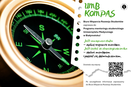 Biuro Wsparcia Rozwoju Studentów Uniwersytetu Medycznego w Białymstoku zaprasza do udziału w pierwszej, pilotażowej edycji programu mentoringowego UMB KOMPAS – nowej inicjatywie, która ma pomóc nowoprzyjętym studentom odnaleźć się w akademickiej rzeczywistości, rozwinąć potencjał i świadomie planować swoją ścieżkę rozwoju.