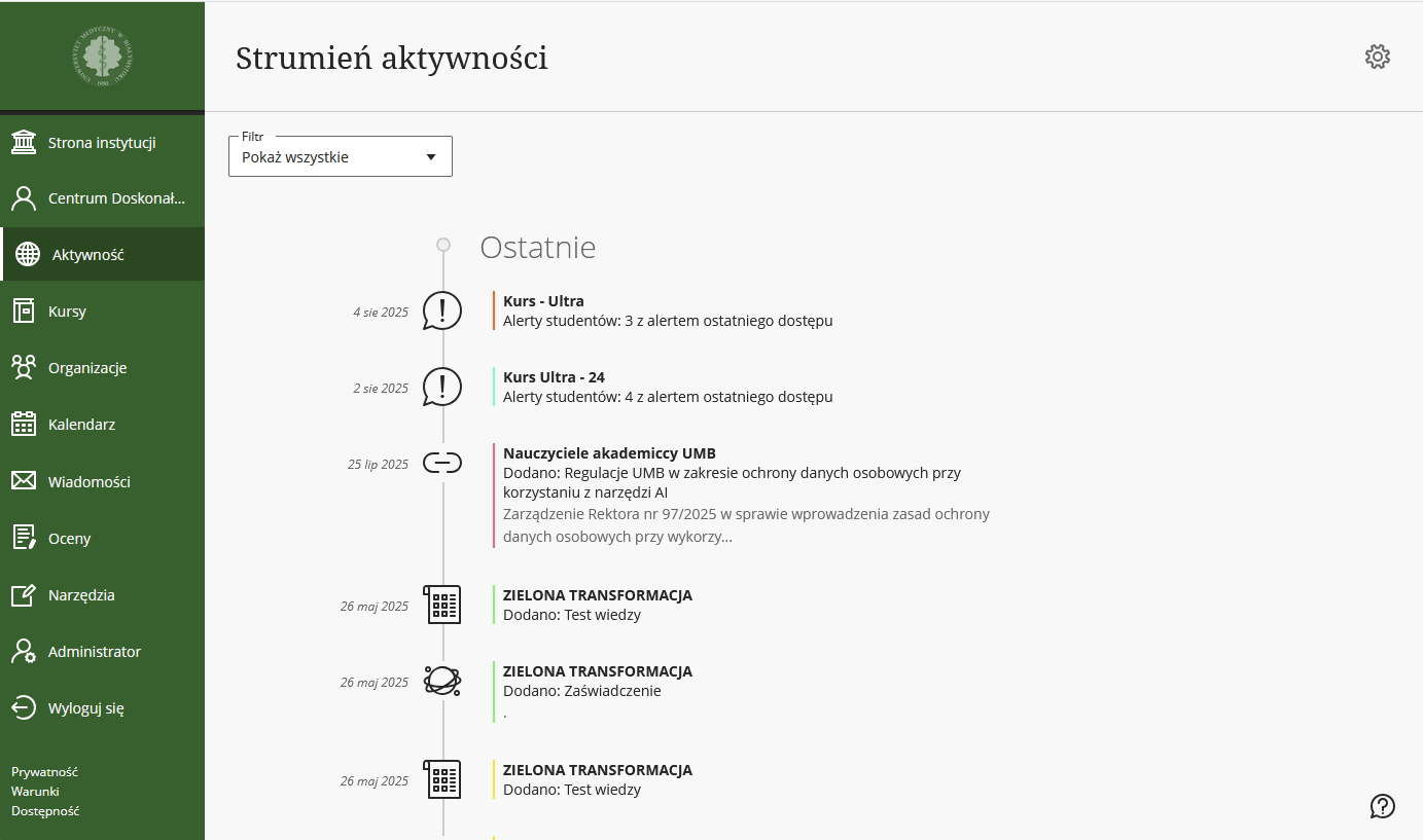 Platforma Blackboard Learn jako system LMS jest wykorzystywana przede wszystkim do tworzenia cyfrowych treści edukacyjnych oraz prowadzenia i zarządzania kursami online. Obie wskazane formy aktualnie warunkują możliwość realizacji kształcenia na odległość na wszystkich realizowanych poziomach kształcenia: studiach jednolitych magisterskich, pierwszego i drugiego stopnia, szkole doktorskiej oraz studiach podyplomowych.