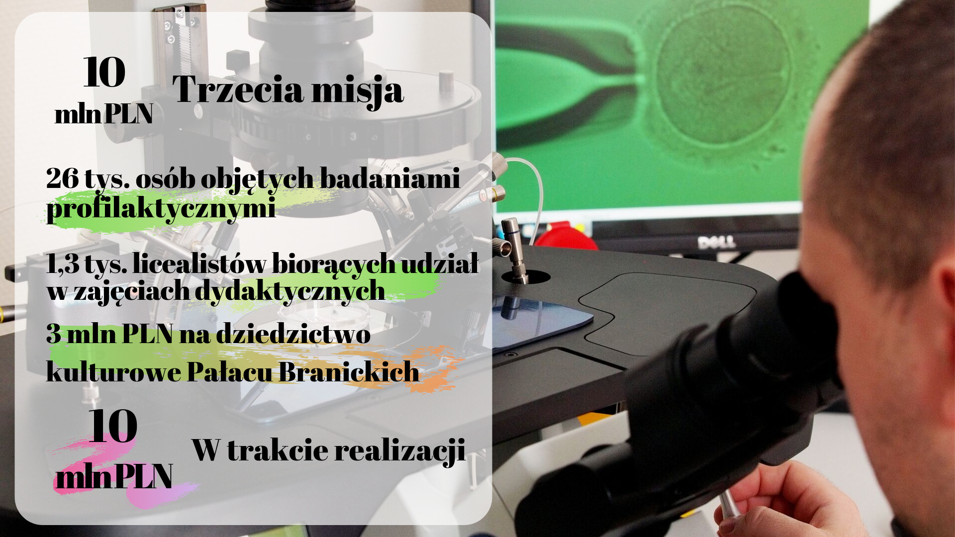Przeglądając korzyści, które nasza uczelnia odniosła dzięki wykorzystaniu funduszy europejskich można dojść do wniosku, że w porównaniu do tak pełnych sukcesów 15 lat, przyszłość będzie wyglądała szaro. Nic bardziej mylnego: najlepsze jeszcze przed nami! Aż 263 miliony PLN z 477 milionów środków pozyskanych z funduszy europejskich jest przeznaczonych na działania będące aktualnie w realizacji - przede wszystkim stworzenie Centrum Badań Innowacyjnych Plus oraz Centrum Psychiatrii Uniwersyteckiego Szpitala Klinicznego i Uniwersyteckiego Dziecięcego Szpitala Klinicznego. Wkład UMB w rozwój regionu został zauważony i doceniony przez władze regionalne, czego efektem jest wpisanie naszej uczelni w strategię rozwoju Podlasia i Białegostoku. Ponadto, projekt CBI PLUS został ujęty w Kontrakcie Terytorialnym dla Województwa Podlaskiego jako jedno z kluczowych przedsięwzięć naszego województwa. Uczelnia ciągle pozyskuje środki na nowe inicjatywy i pomimo zmieniających się priorytetów dysponowania finansami publicznymi, wciąż jest wiele obszarów, które nie tylko warto, ale nawet trzeba wesprzeć. Należy również pamiętać, iż zmieniający się świat niejako wymusza inwestycję w obszary, które jeszcze kilka lat temu - na przykład 15 - miały charakter niszowy lub w ogóle nie istniały. Przykład? Pierwszy symulator pacjenta pojawił się w Polsce dopiero w 2009 roku - w tym samym roku pojawiły się aplikacje mobilne. Pierwsze zajęcia w Centrum Symulacji Medycznej UMB odbyły się w roku akademickim 2017/18. Liczymy zatem na to, że za 15 lat będziemy mogli podsumować osiągnięcia, które dopiero się narodzą w głowach naszych wybitnych naukowców.