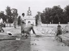 Ludzie spacerują obok pomnika Marszałka Piłsudskiego, bo teraz nie ma tu śladu po jezdni, którą (nie) jeździ piątka i siódemka.