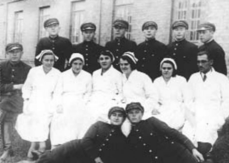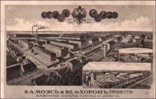 | Szpital powstał w ruinach spalonej w 1915 r. przez cofającą się armię rosyjską fabryce sukna, koców i kortów Augusta Moesa w Choroszczy |