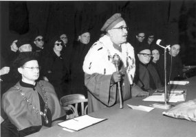 Pomieszczenia dla studium znaleziono po organizacjach młodzieżowych na zapleczu auli wykładowej w Collegium Uniwersum. Prawda, studenci od decyzji przeniesienia ich siedzib organizacyjnych w inne miejsca, odwołali się do Komitetu Wojewódzkiego PZPR, ale dyr. Popowski, powiedział, że to decyzja rektora i na tym interwencja partii się skończyła. Kiedy po wyprowadzce weszły sprzątaczki, żeby zrobić porządek, to po uprzątnięciu, zaproponowały mi, aby pomieszczenia te ksiądz wyświęcił, a na moje pytanie, dlaczego, odpowiedziały: - Ci zbereźnicy zostawili za szafami pół wiadra zużytych prezerwatyw. I ten grzech tylko święcenie zlikwiduje. Inaczej będzie tu straszyć. W odpowiedzi powiedziałem, że tym studentom należy zazdrościć, a nie wzywać księdza. Zgorszone panie sprzątaczki oświadczyły, że o mnie miały lepsze zdanie…