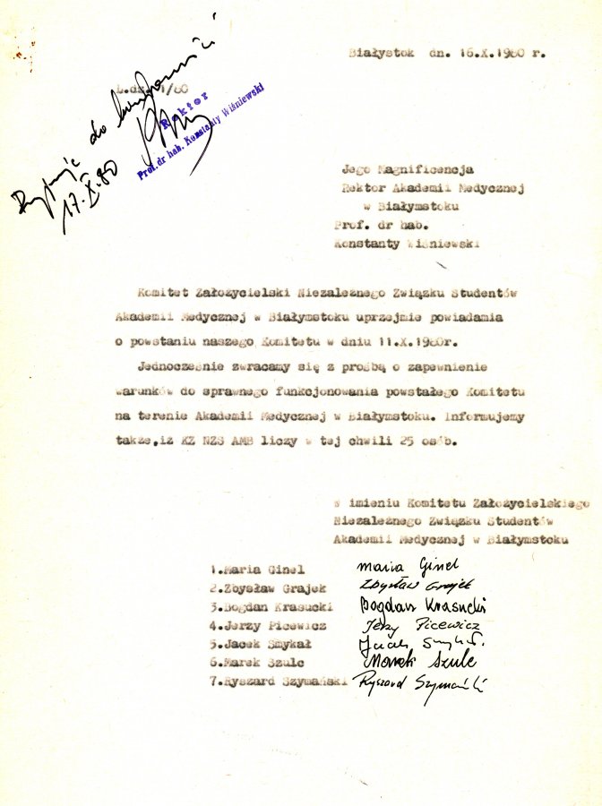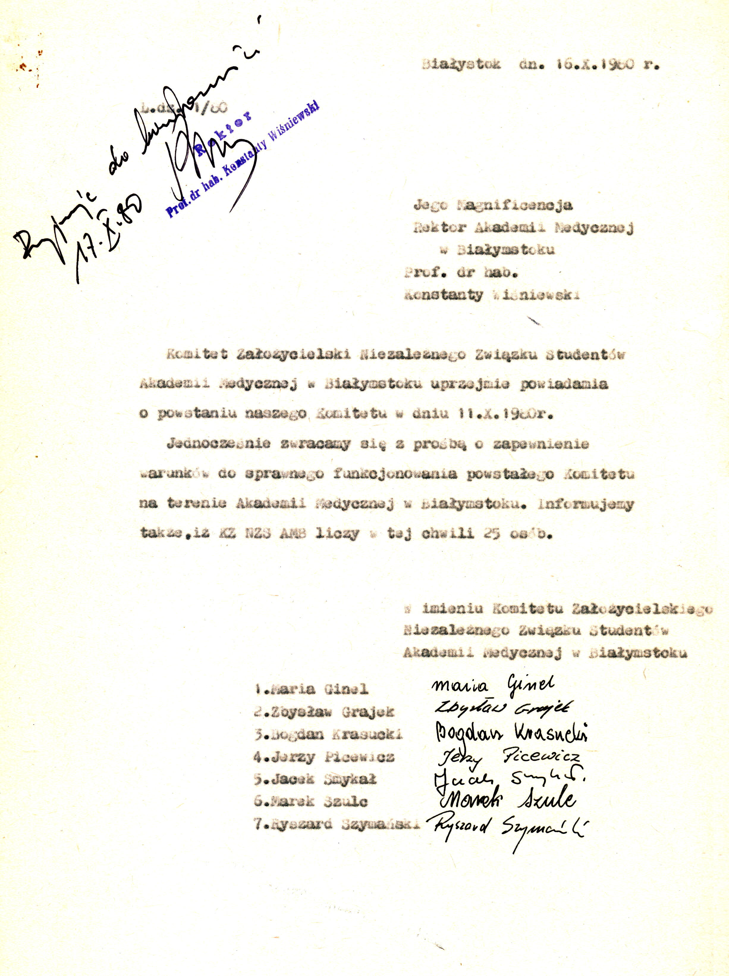 Formalnie Komitet Założycielski NZS AMB powstał 11 października. Zgodnie z ówczesnym prawem, musiał liczyć minimum dziesięć osób. Na całej liście założycielskiej znalazło się 25 studentów. Inicjatorzy założenia NZS-u na naszej uczelni powiadomili rektora. Było to dla nas bardzo ważne. Zawiadamialiśmy, a nie prosiliśmy o zgodę na zorganizowanie zrzeszenia. Olbrzymia zmiana jakościowa. Poczuliśmy się podmiotem, a nie przedmiotem. Pod pismem podpisaliśmy się w kolejności alfabetycznej: Maria Ginel, Zbysław Grajek, Bogdan Krasucki, Jerzy Picewicz, Jacek Smykał, Marek Szulc, Ryszard Szymański. Odbyły się także formalne spotkania z władzami akademii. Przebiegały w spokojnej atmosferze.