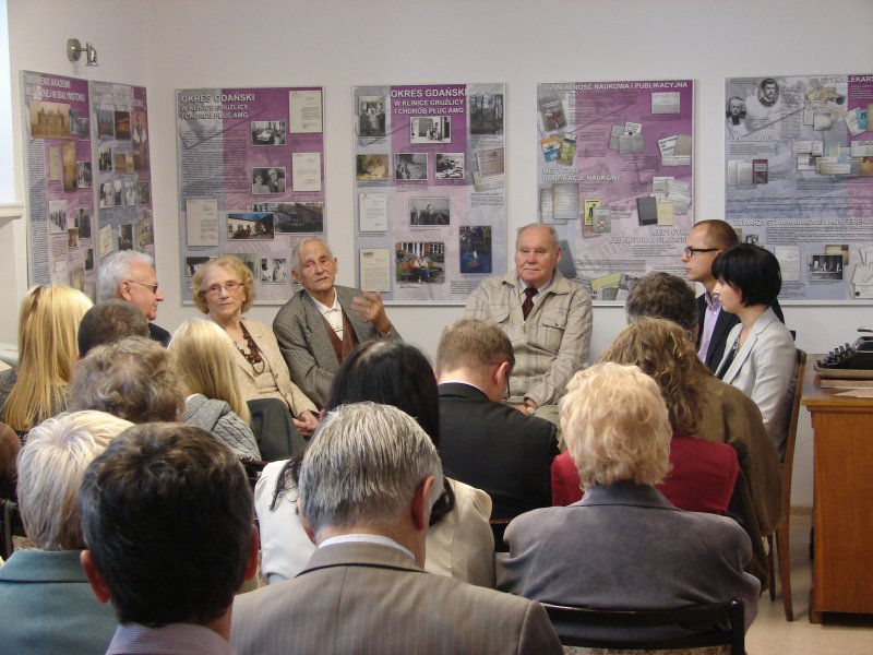 Naszym tegorocznym celem było przywrócenie wspomnień pierwszych absolwentów Uniwersytetu Medycznego w Białymstoku o studenckiej codzienności lat 50-tych XX wieku. W końcu września w Muzeum Historii Medycyny i Farmacji UMB odbyło się spotkanie, podczas którego tajemnice swoich studenckich czasów i pierwszych lat UMB odkrywali: dr Teresa Kurowska, prof. Marian Furman, prof. Jan Stasiewicz oraz doc. Jan Pietruski. Dyskusję moderował mgr Andrzej Guzowski. Zgromadzeni goście mogli wysłuchać opowieści o medycynie zgłębianej w trudnych, głównie z politycznych i organizacyjnych względów, czasach. Szczególną atmosferę nadawały spotkaniu dwie wystawy. Pierwsza poświęcona Ich Rektorowi – „Prawie cały wiek dwudziesty. Życie i działalność Tadeusza Kielanowskiego”. Wystawa ta jest pokłosiem pracy doktorskiej dr Jacka Halasza z Uniwersytetu Medycznego w Gdańsku. Druga wystawa pt. „Białostoccy Herkulesi – akademicka codzienność pierwszych studentów Uniwersytetu Medycznego w Białymstoku” została przygotowana specjalnie z okazji tegorocznych EDD. Składa się ona z dwóch części: planszowej i eksponatowej, złożonej głównie z pamiątek pierwszych absolwentów. Na wystawie zostały przedstawione etapy życia studenckiego: od momentu zdawania egzaminów wstępnych, poprzez naukę, warunki lokalowe, aż po absolwentówkę i nakazy pracy. Możemy dowiedzieć się z niej o wymaganych od studentów dodatkowych dokumentach świadczących o przynależności do PZPR, działalności rodziców na polu robotniczym czy posiadanej ziemi. Specyfikę tamtych lat oddają także tematy prac egzaminacyjnych – o radzieckiej służbie zdrowia czy o teorii Miczurina i Łysenki. Pierwsi studenci budowali swoją przyszłą wiedzę lekarską równocześnie budując od podstaw nową uczelnię medyczną. Uczelnię, która dziś znajduje się w czołówce polskich uniwersytetów medycznych. Zaś w 1950 roku powstawała z gruzów na bazie dawnego pałacu Branickich i Seminarium Nauczycielskiego. W bardzo skromnych warunkach lokalowych w październiku 1950 roku rozpoczęto naukę. Brakowało pomocy dydaktycznych – podręczniki dzielono na części, aby każdy ze studentów mógł zgłębić ich treść. Wiele pomocy dydaktycznych stworzyli pracownicy poszczególnych zakładów. Na wystawie można obejrzeć m.in. plansze anatomiczne wykonane przez Stanisława Wakulińskiego, pierwsze preparaty anatomiczne, podręczniki. Wielką pracę wykonali ówcześni profesorowie, których sylwetki z rozrzewnieniem wspominali absolwenci. Poza nauką czas pierwszych studentów był wypełniany sportem, zabawą (m.in. zespół Rewelersów), szkoleniem wojskowym czy ekspedycjami wykopaliskowymi. Życie studenckie w tamtych czasach było bardzo mocno warunkowane polityką. Odciskała ona swoje piętno w postaci Komisji Dyscyplinarnych, na których odpytywano m.in. z zainteresowań, sposobu spędzania czasu wolnego itp. Obowiązkowe było także uczestnictwo w pochodach 1-majowych. Na jednym z nich, w 1952 roku PZPR nakazała przygotowanie grupy inscenizacyjnej ukazującej – w związku z toczącą się wojną w Korei - ohydę amerykańskiego i niemieckiego imperializmu. Koniec studiów to szczególny czas we wspomnieniach: ostatni wykład z prof. T. Kielanowskim, absolwentówka, dyplomy lekarskie, w tym pięć czerwonych. Po studiach naszych absolwentów obowiązywały jeszcze nakazy pracy, będące wyrazem planowej polityki zdrowotnej ówczesnego systemu komunistycznego.
