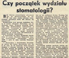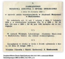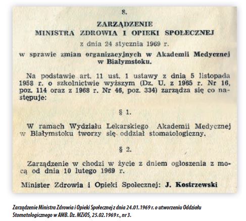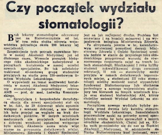 W bieżącym roku mija 50 lat od kiedy na naszej uczelni kształcą się stomatolodzy. Swoje powstanie Oddział Stomatologii zawdzięcza Rektorowi AMB prof. Ludwikowi Komczyńskiemu. Widział on potrzebę powołania Wydziału Stomatologicznego ze względu na niedobór lekarzy dentystów na terenie województwa białostockiego (w tym okresie brakowało na naszym terenie około 200 lekarzy tej specjalności).
