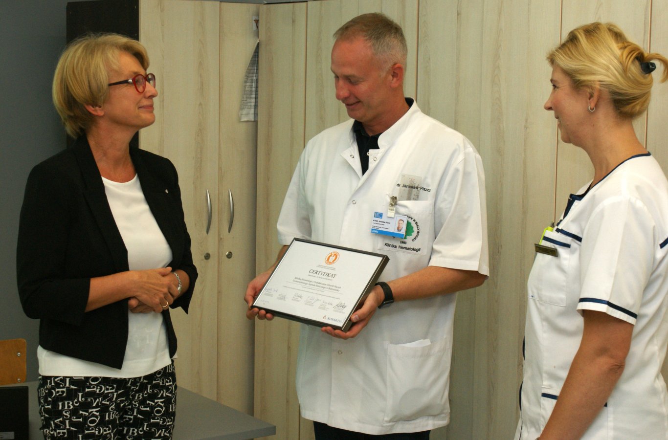 - Ten certyfikat to uznanie naszej pracy i profesjonalnej opieki nad pacjentami z przewlekłą białaczką szpikową - mówi dr hab. Jarosław Piszcz, zastępca kierownika Kliniki Hematologii w USK. - Ten dokument to także potwierdzenie pewnej drogi, którą jako klinika przeszliśmy. Nasze pielęgniarki mają za sobą odpowiednie szkolenie, a swoją wiedzą codziennie dzielą się z pacjentami. Dlaczego to takie ważne? Chory często ma ograniczony kontakt z personelem medycznym. Podczas wizyty lekarskiej nie zawsze się uda wyjaśnić wszystkie wątpliwości. Zresztą często te pytania, które go nurtują, nie pojawiają się w czasie wizyty, ale przychodzą do głowy w domu, przed snem czy rano po obudzeniu. Nasi podopieczni mają podane numery telefonu do pielęgniarek, mogą w każdym momencie dzwonić i pytać o to, co ich nurtuje. Poradzić się, czy trzeba zgłosić się do lekarza, czy też spać spokojnie. Dzięki temu nie czują się w tej chorobie osamotnieni.
