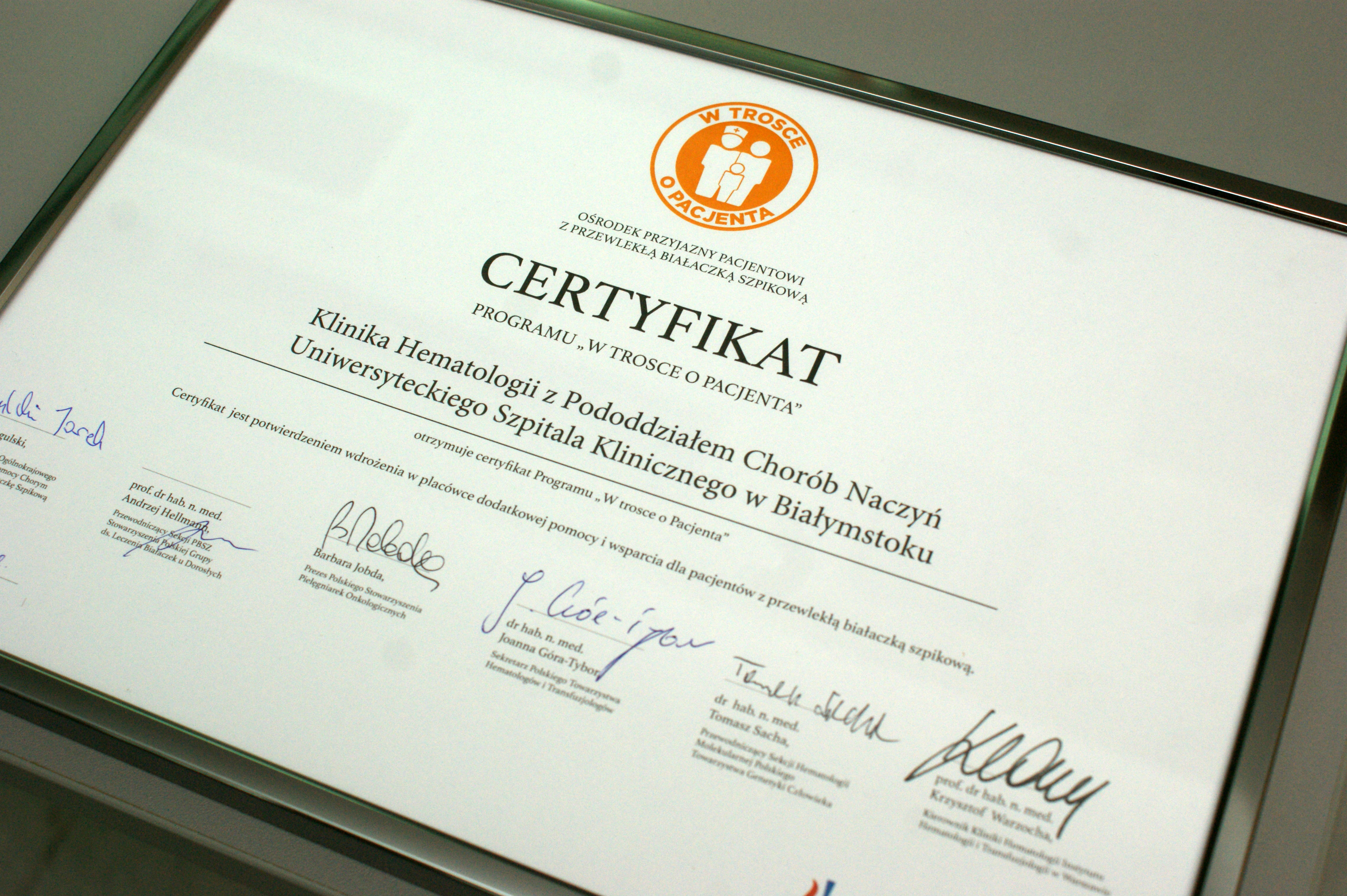 Klinika Hematologii z Pododdziałem Chorób Naczyń Uniwersyteckiego Szpitala Klinicznego w Białymstoku otrzymała 12 września certyfikat programu „W trosce o pacjenta”. To wyróżnienie to sygnał dla chorych na przewlekłą białaczkę szpikową, że w tym ośrodku mogą liczyć na kompleksową pomoc i wsparcie.
