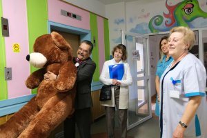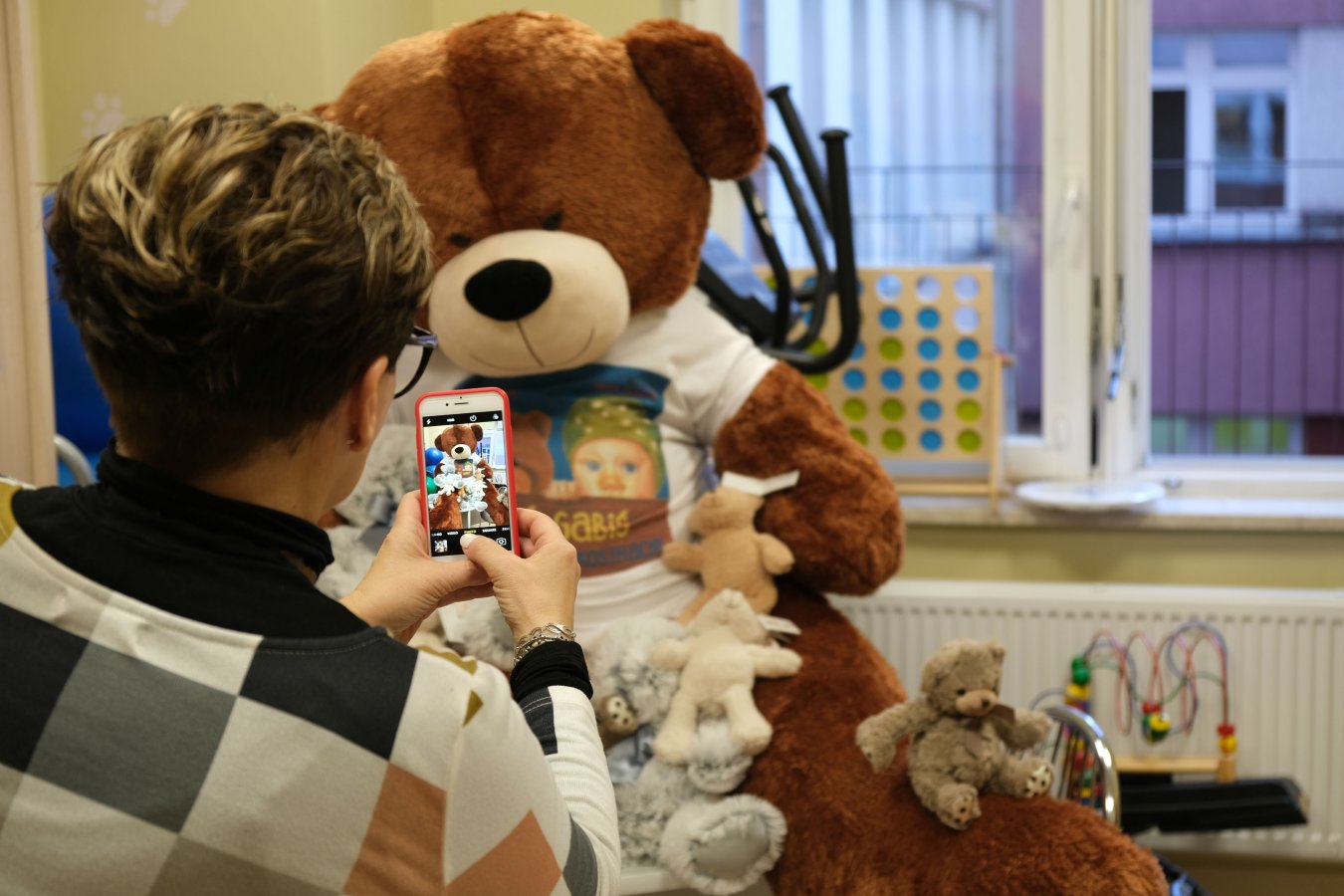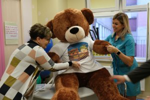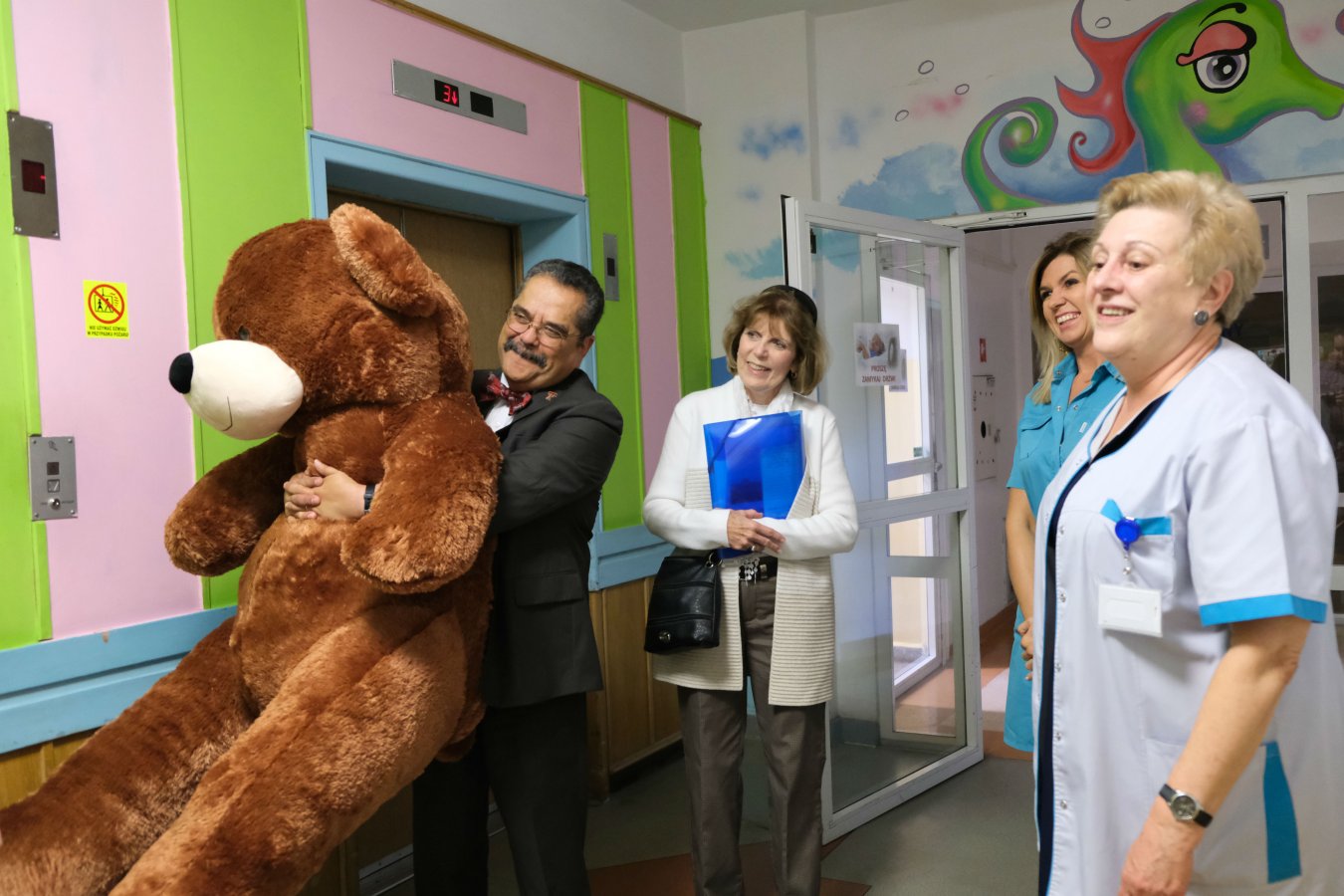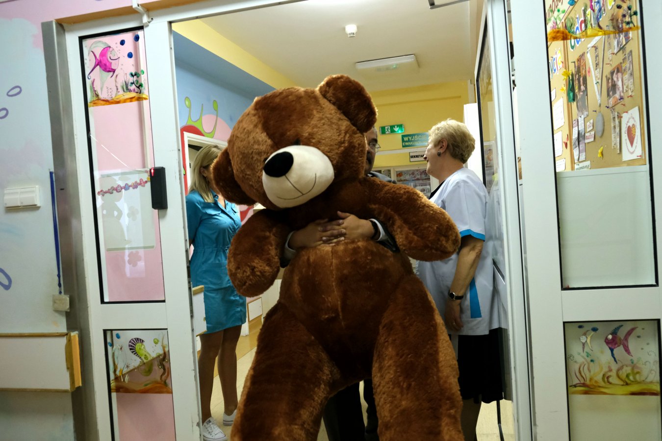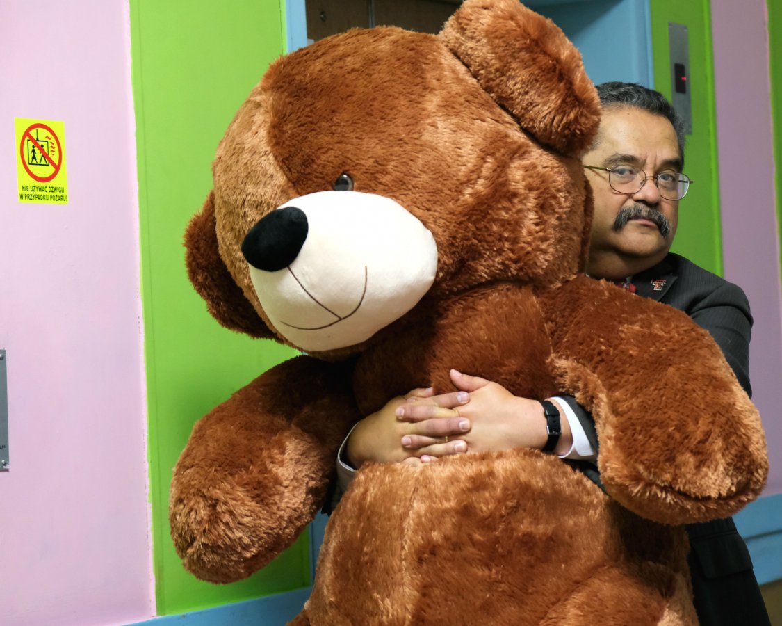 Największego misia do kliniki wnosił dr Jose Manuela De La Rosa M.D. wiceprezydent Texas Tech University. Dzień wcześniej podpisał umowę o współpracy uczelni z Teksasu i UMB. Od razu maskotkom rozdzielono zadania. Ta największa trafiła do świetlicy w poradni onkologicznej, gdzie ma wspierać małych pacjentów. Mniejsze misie trafiły bezpośrednio do chorych dzieci w klinice (zabiorą je do domów).