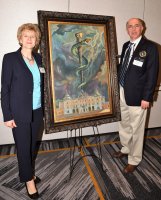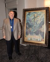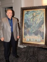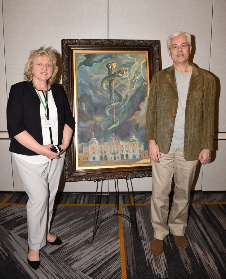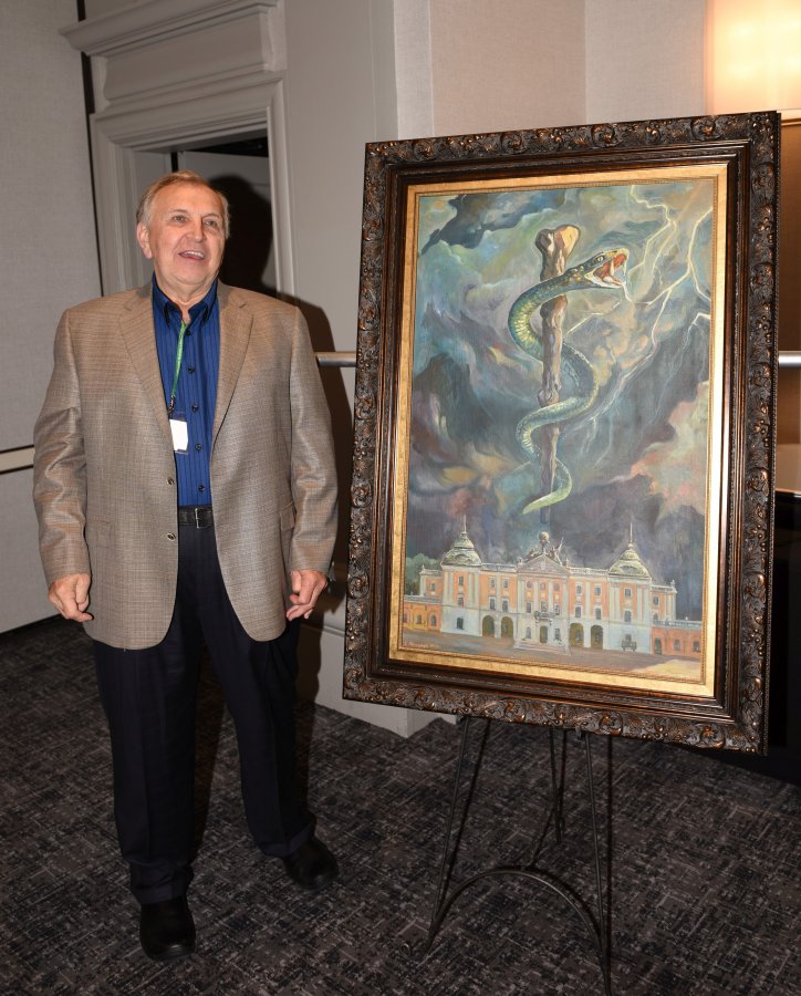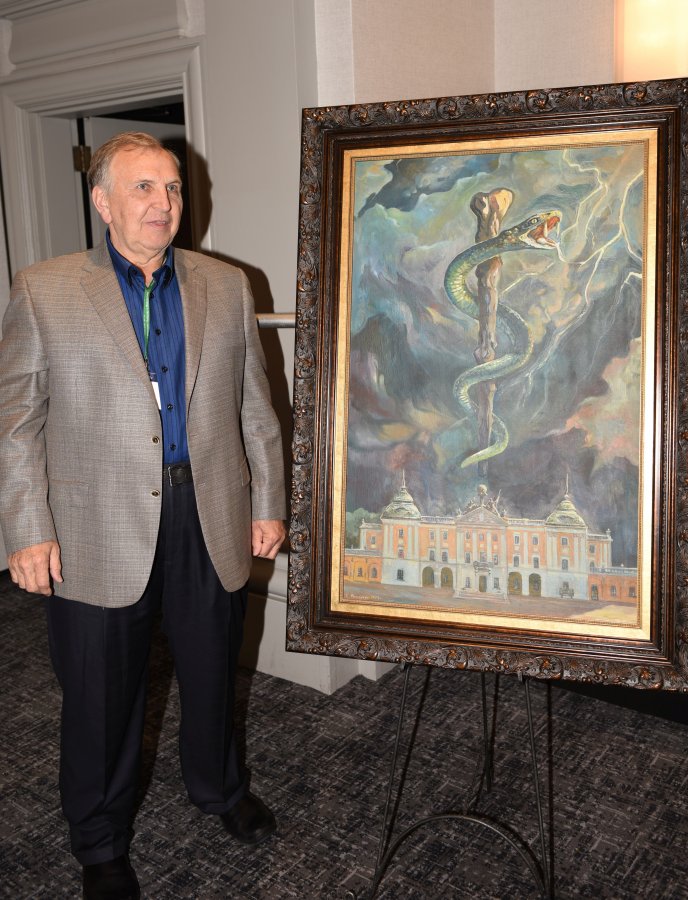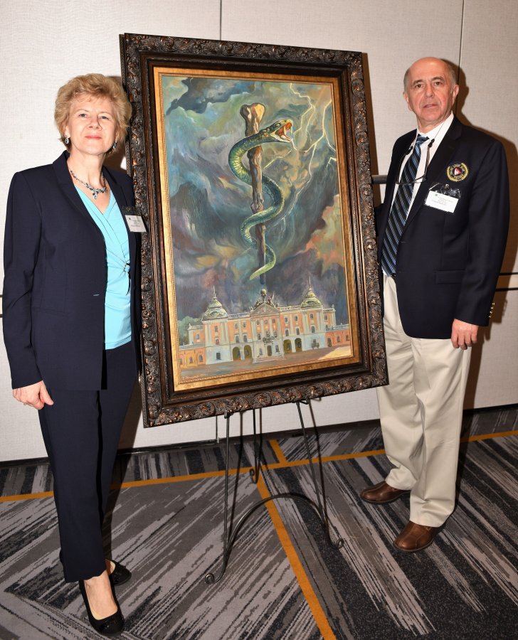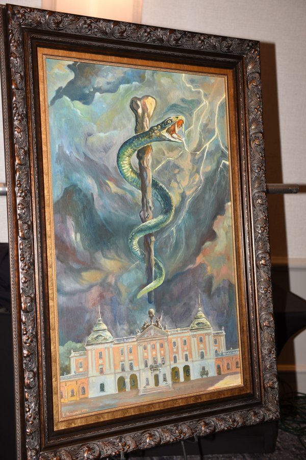 Pałac Branickich to metafora wiedzy, wąż to Eskulap - znak medycyny, ciemne chmury to zmaganie się chorych z bólem - taka jest symbolika obrazu przekazanego przez Krzysztofa Siwka, naszego absolwenta w USA, rektorowi Adamowi Krętowskiemu.