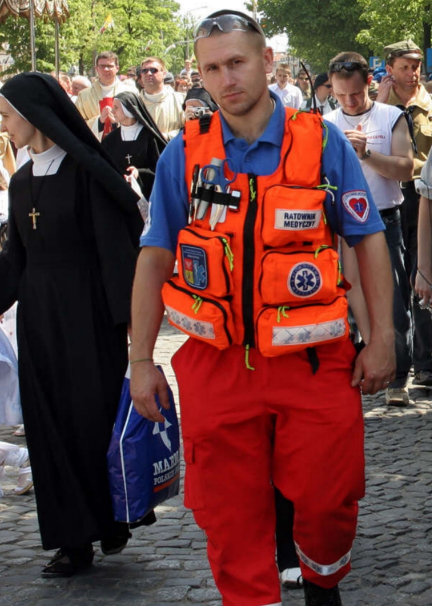 - Okazało się, że kumplom, którzy mieli mi pokazać Italię, cofnięto urlopy - mówi. - Co miałem robić? Przecież nie było sensu, żebym sam jeździł. Poprosiłem, aby pozwolono mi z nimi popracować. Sprawdzono moje dokumenty, doświadczenie. Moi znajomi poręczyli moją wiedzę i przez miesiąc mogłem pracować w grupie ratownictwa specjalnego przy Watykanie. Byliśmy zabezpieczeniem ratowniczym dla papieża Jana Pawła II. Pracowałem tam, w Watykanie, na placu św. Piotra, jak też latałem w specjalnym śmigłowcu ratowniczym.