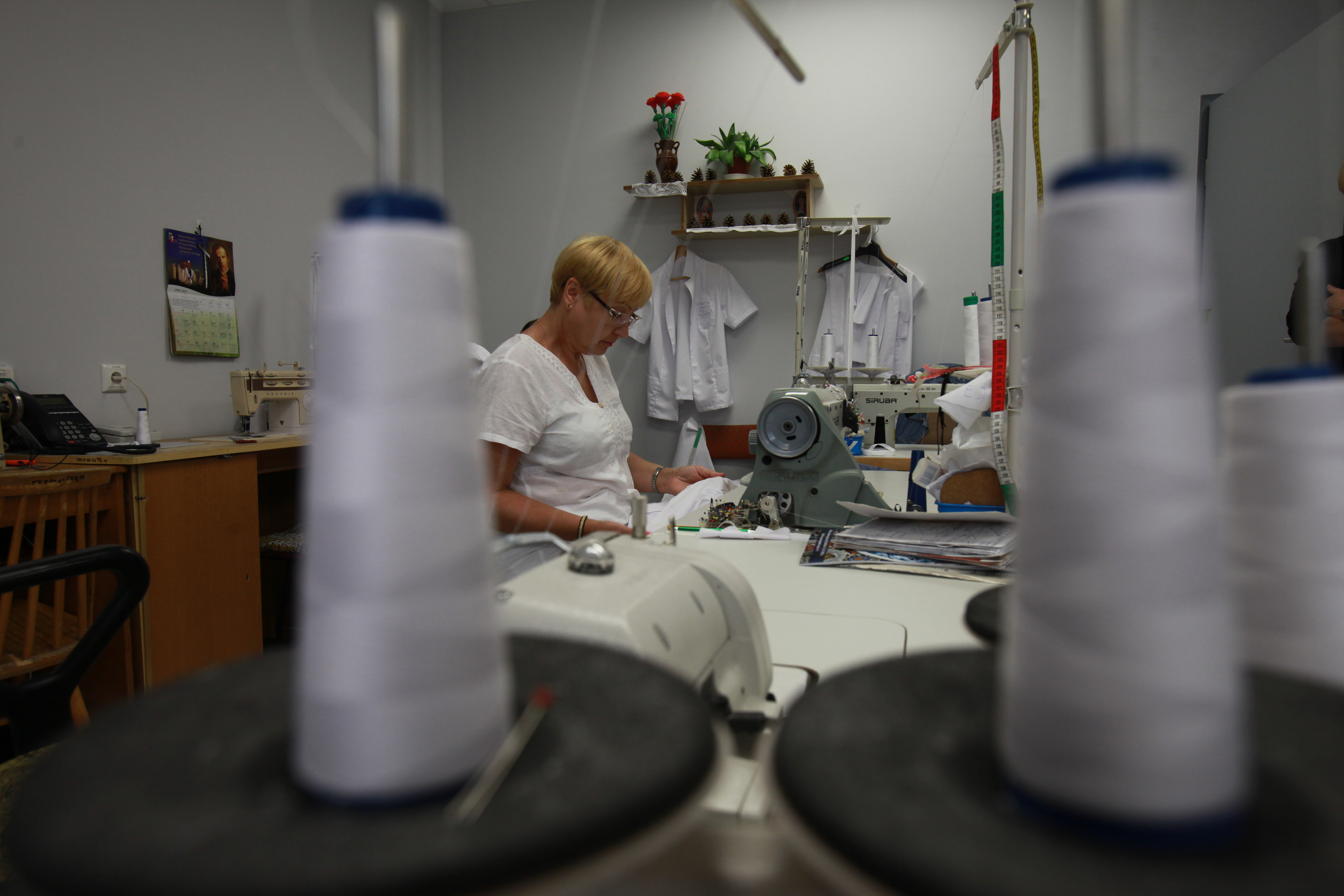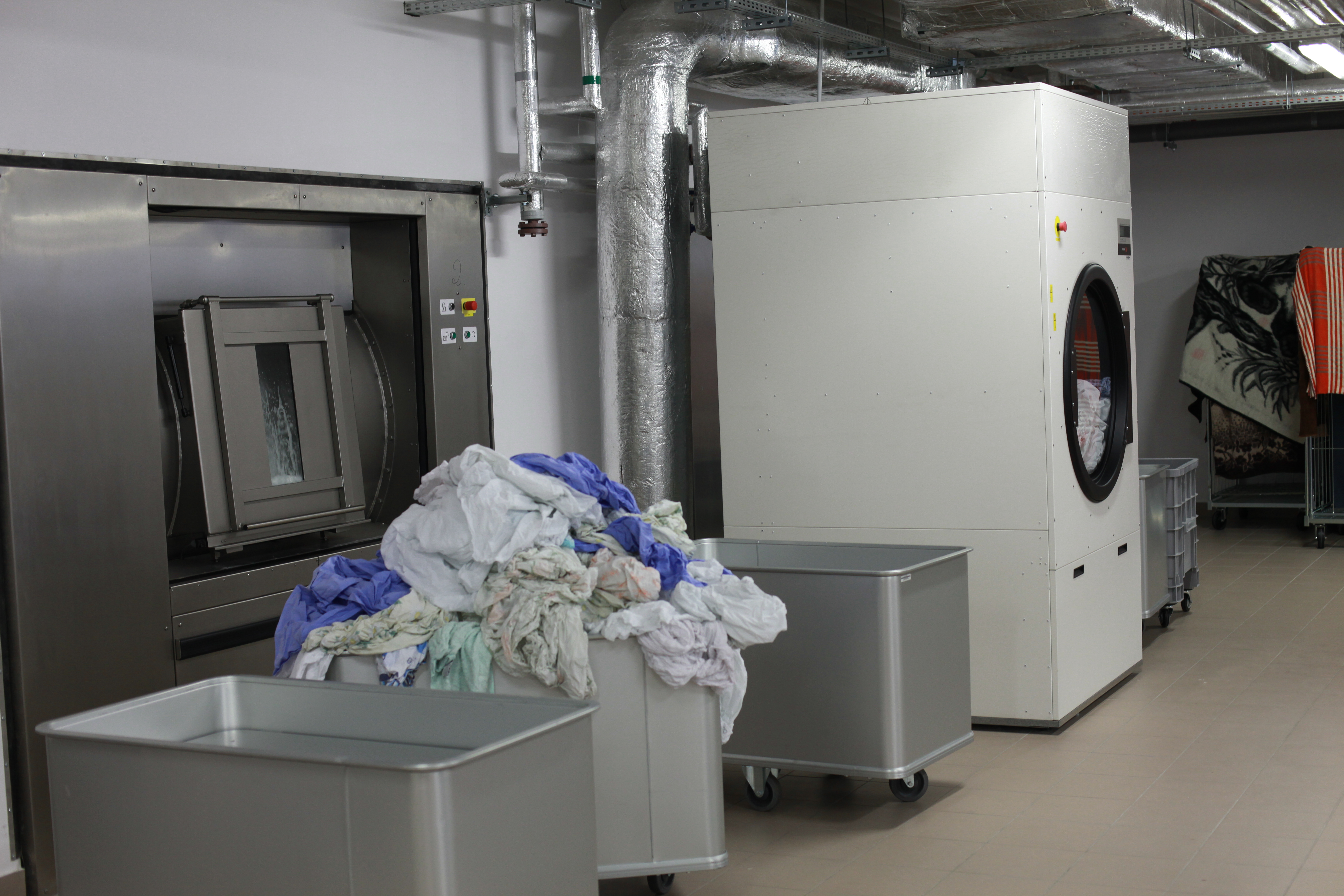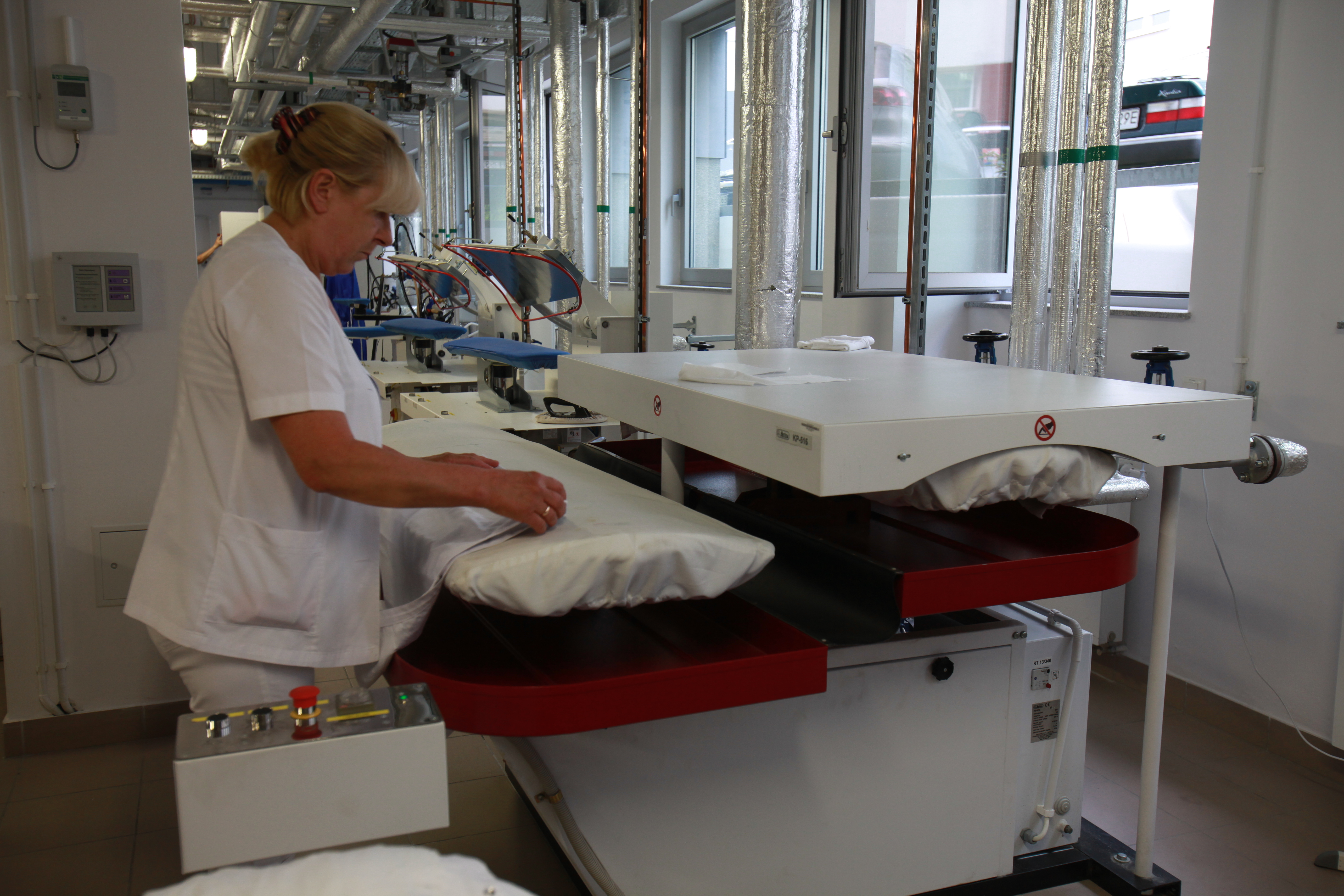 Pralnia połączona jest ze szwalnią, gdzie na potrzeby szpitala szyta jest pościel, fartuchy i ubrania dla personelu. Pralnia składa się z części brudnej i czystej. Do brudnej trafia zużyta pościel, koce, poduszki i materace z całego szpitala. Tu następuje ich segregacja. A następnie wszystko jest pakowane do pralnic. Jednorazowo mieści się tam około 170-180 kg wsadu (dla porównania przeciętna domowa pralka mieści od 5 do 7 kg prania!). Pralnica połączona jest z systemem automatycznego dozowania proszków i płynów dezynfekujących. Ilość jest dobierana w zależności od ilości załadowanej bielizny. Nie ma więc możliwości, by ktoś się pomylił i dał za dużo czy za mało środka piorącego. Po zakończeniu cyklu, pranie wyjmowane jest z drugiej strony pralnicy - po tzw. stronie czystej. Następnie wszystko trafia do olbrzymich suszarek, a stamtąd na maglownice. Z maglownic, złożone pranie trafia do kontenerów. Po segregacji zaś rozwożone jest do poszczególnych klinik. Miesięcznie przez szpitalną pralnie przechodzi ponad 50 ton prania.