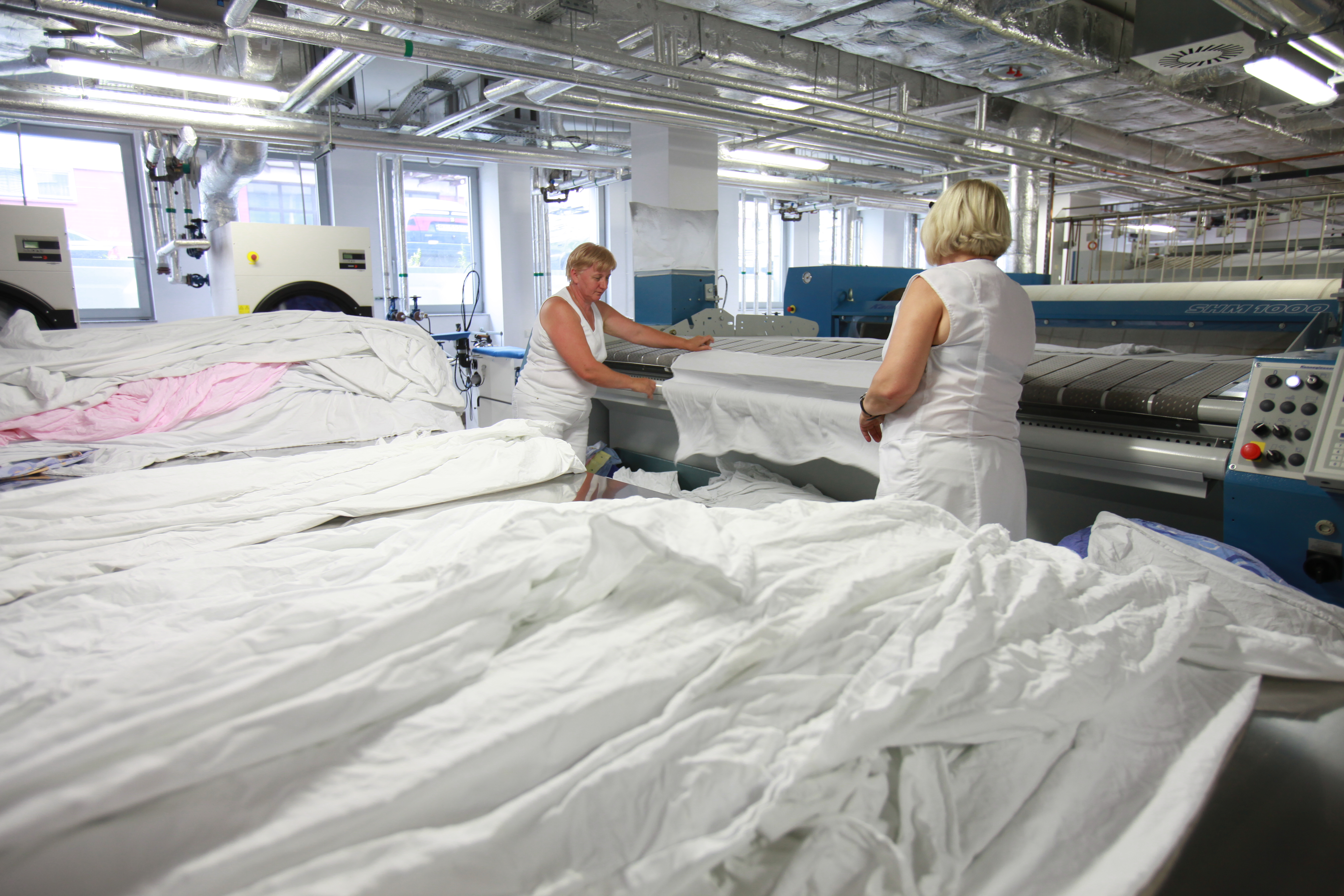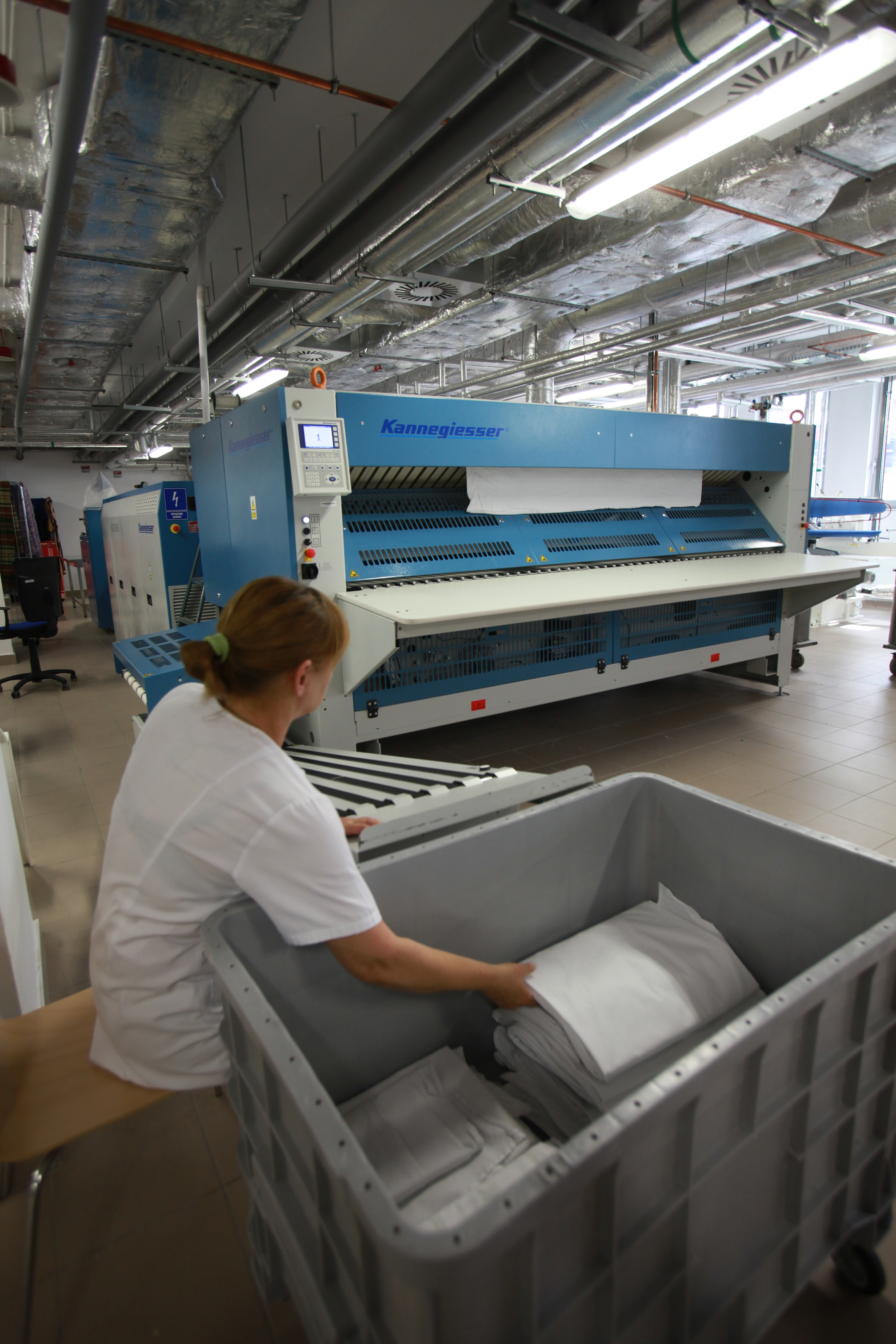 z maglownicy pościel schodzi wyprasowana i złożona w kostkę. Teraz wystarczy ją tylko ułożyć w kontenerze.