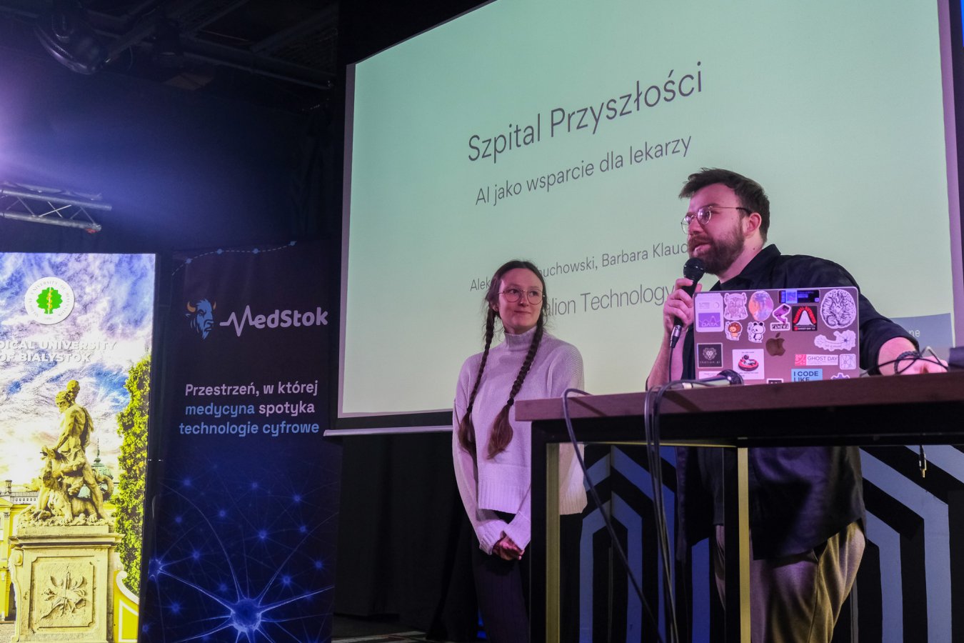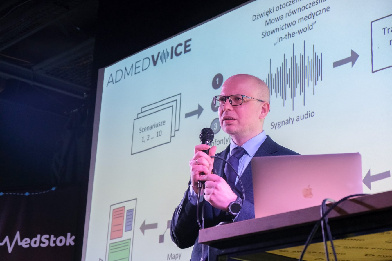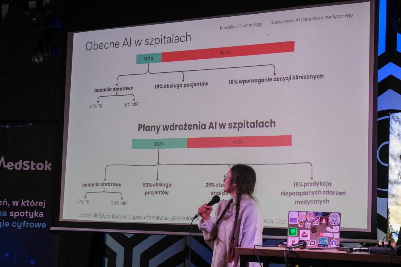 Na scenie pokazano dwie prezentacje. Pierwsza pt. Szpital Przyszłości: AI jako wsparcie dla lekarzy (Barbara Klaudel, Aleksander Obuchowski, oboje z firmy Medalion Technology); druga - ADMEDVOICE: adaptacyjny system inteligentnego przetwarzania mowy lekarzy wraz ze strukturalizacją informacji (Mariusz Budzisz, Uniwersyteckie Centrum Kliniczne w Gdańsku oraz Piotr Szczuko z Politechniki Gdańskiej). W obu przypadkach chodziło o odciążenie lekarzy w powtarzalnej pracy administracyjnej. A wszystko dlatego, że ponad połowa czasu, którą medyk przeznacza na przyjęcie pacjenta, to praca związana z wypełnianiem dokumentów. To zwykle powtarzalne zadania, niezbyt skomplikowane, ale czasochłonne.