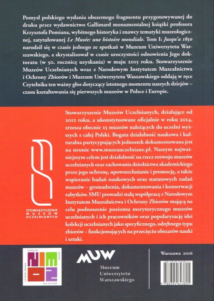Pomysł polskiego wydania obszernego fragmentu przygotowanej do druku przez wydawnictwo Gallimard monumentalnej książki profesora Krzysztofa Pomiana, wybitnego historyka i znawcy tematyki muzeologicznej, zatytułowanej Le Musée: une histoire mondiale. Tom I: Jusqu’a 1850 narodził się w czasie jednego ze spotkań w Muzeum Uniwersytetu Warszawskiego, a skrystalizował w czasie uroczystości odnowienia Jego dokroratu (w 50. rocznicę uzyskania) w maju 2015 roku. Stowarzyszenie Muzeów Uczelnianych wraz z Narodowym Instytutem Muzealnictwa i Ochrony Zbiorów i Muzeum Uniwersytetu warszawskiego oddają w ręce Czytelnika ten ważny głos dotyczący istotnego momentu naszych dziejów – czasu kształtowania się pierwszych muzeów w Polsce i Europie.