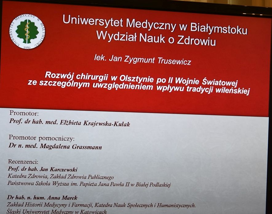 Uniwersytet Medyczny w Białymstoku po raz kolejny udowodnił jak dużą wagę przykłada się do ochrony i propagowania dziedzictwa medycznego. W historii Uczelni postały trzy doktoraty o tematyce związanej ściśle z historią medycyny. Pierwszą pracę nt. Białostockiej służby zdrowia do 1944 roku obronił w 1965 roku Ryszard Zabłotniak. Druga poświęcona Szpitalnictwu w województwie białostockim w okresie międzywojennym napisała w 2009 roku Magdalena Grassmann. W dniu 20 marca 2017 roku w Auli Magna Pałacu Branickich odbyła się obrona doktorska trzeciej w historii pracy. Lek. Jan Zygmunt Trusewicz przedstawił pracę pt.: Rozwój chirurgii w Olsztynie po II wojnie światowej ze szczególnym uwzględnieniem wpływu tradycji wileńskiej. Promotorem głównym była prof. dr hab. Elżbieta Krajewska-Kułak - kierownik Zakładu Zintegrowanej Opieki Medycznej UMB zaś promotorem pomocniczym dr Magdalena Grassmann - kierownik Samodzielnej Pracowni i Muzeum Historii Medycyny i Farmacji UMB. Recenzentami pracy byli: prof. Jan Karczewski z Katedry Zdrowia i Zakład Zdrowia Publicznego Państwowej Szkoły Wyższej im. papieża Jana Pawła II w Białej Podlaskiej oraz dr hab. Anna Marek - kierownik Zakładu Historii Medycyny i Farmacji i Katedry Nauk Społecznych i Humanistycznych Śląskiego Uniwersytetu Medycznego w Katowicach. Powstała praca jest owocem długich kwerend archiwalnych m.in. w Olsztynie, Białymstoku i Wilnie. Jest też przede wszystkim pięknym dowodem na kultywowanie dziedzictwa wileńskiej medycyny do dnia dzisiejszego. Medycyna olsztyńska po II wojnie światowej została zorganizowana przez środowisko lekarzy przybyłych głównie z Wilna: dr Jana Janowicza, dr Floriana Piotrowicza, dr Jana Rymiana oraz dr Mieczysława Pimpickiego. Doktorat ten jest nade wszystko pracą pisaną sercem, bardzo głęboko związanym z Wileńszczyzną. Doktor Zygmunt Trusewicz urodził się bowiem w Trokach koło Wilna i z tym terenem pozostaje związany sentymentalnie do dziś. Jego praca zaś jest bardzo ważnym krokiem w kierunku odkrywania i kultywowania dziedzictwa medycyny Europy środkowo-wschodniej.