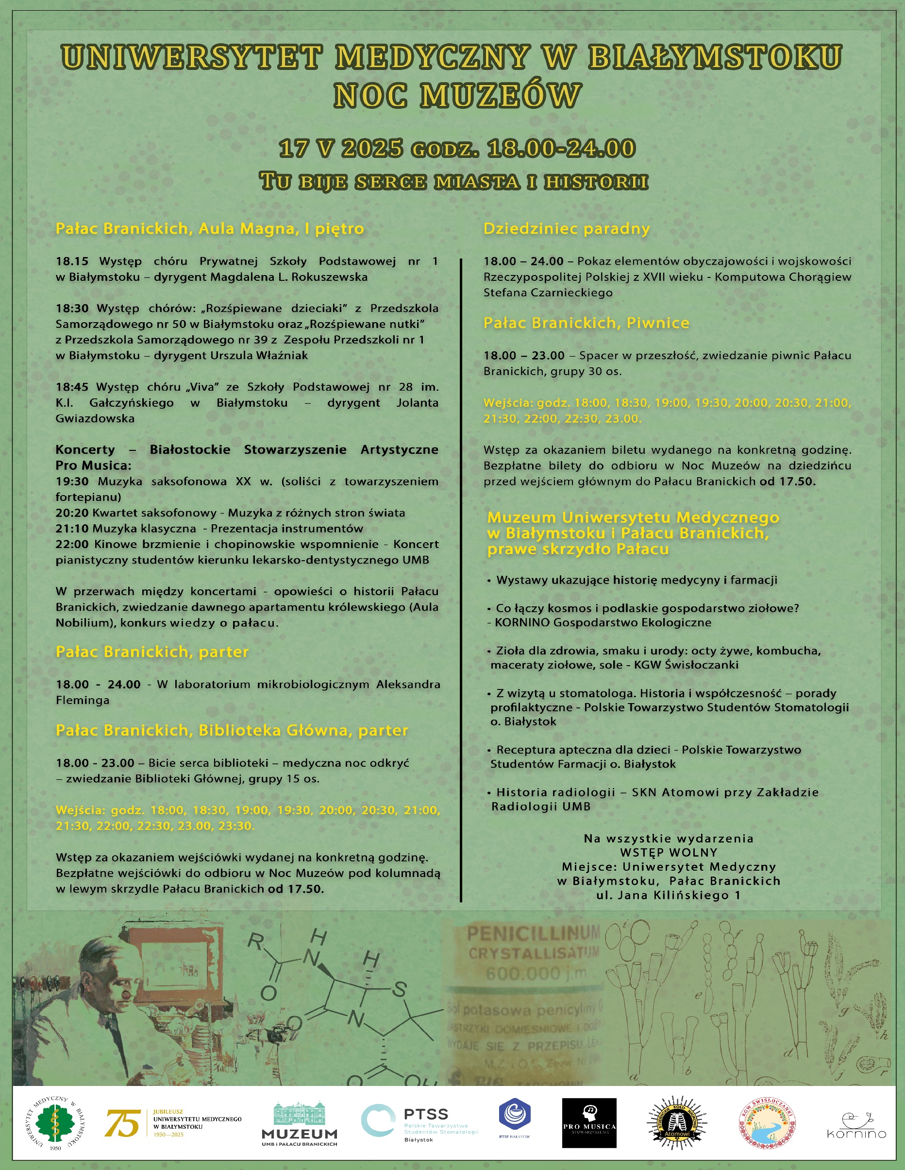 Ze względu na obywającą się jutro (17.05) Noc Muzeów, nasze Muzeum UMB i Pałacu Branickich będzie czynne od godziny 18:00 do 24:00. Zachęcamy również do zapoznania się z programem, ponieważ w tą wyjątkową noc, zwiedzanie to tylko jedna z wielu atrakcji, jakie czekają na Państwa w naszym Pałacu. W niedzielę (18.05) Muzeum będzie nieczynne, ale tego dnia zapraszamy Państwa do udziału w Rodzinnym Pikniku Naukowym na Stadionie Chorten Arena, gdzie będzie można zwiedzić zrekonstruowane laboratorium Alexandra Fleminga przygotowane przez naszą reprezentacje.