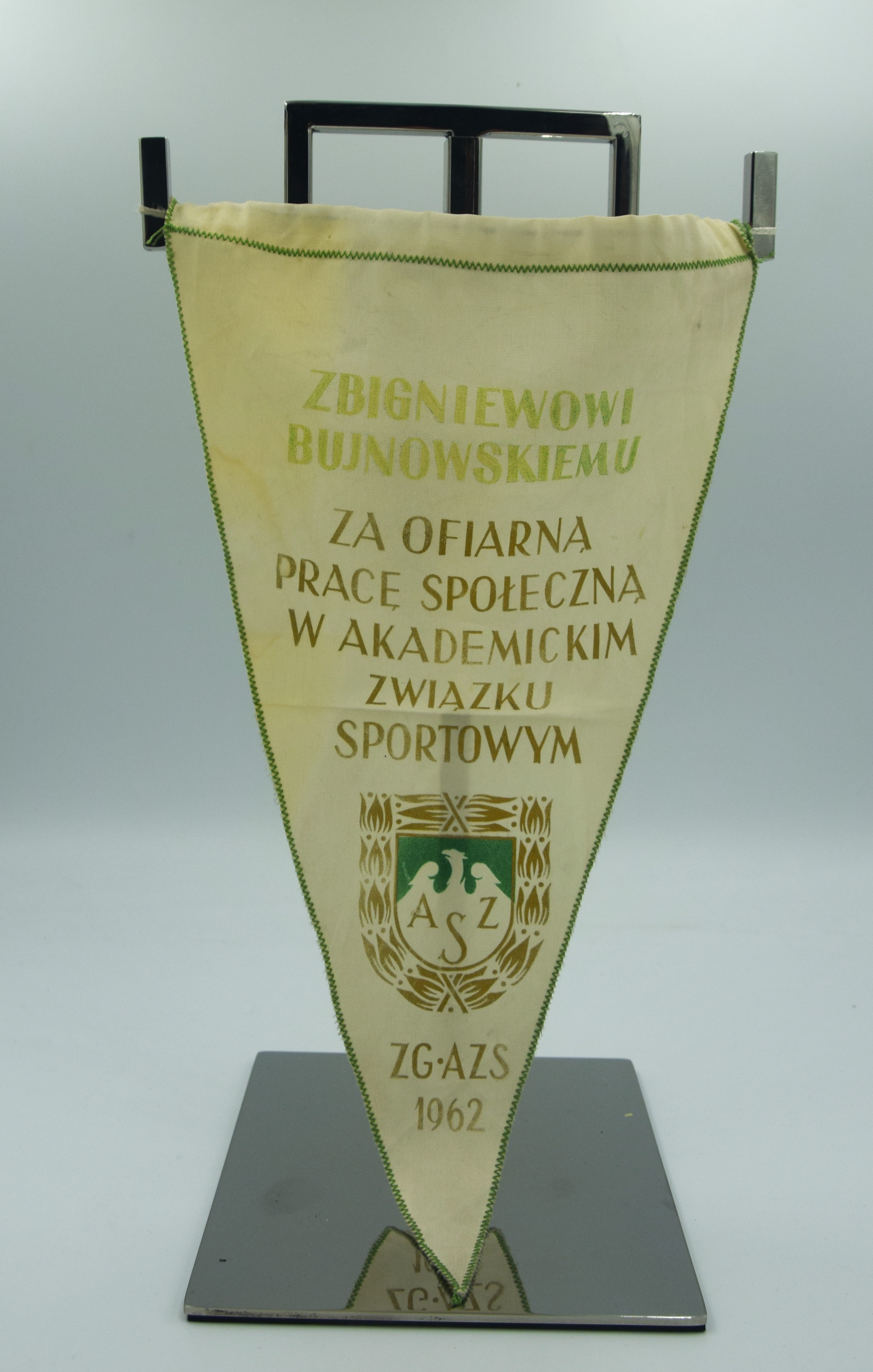 3. Proporzec dr Zbigniewa Bujnowskiego z podziękowaniem za pracę w AZS z 1962 roku. Zbiory Muzeum UMB.