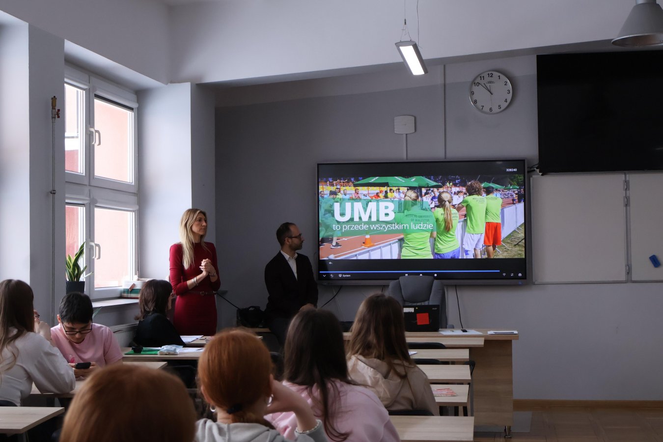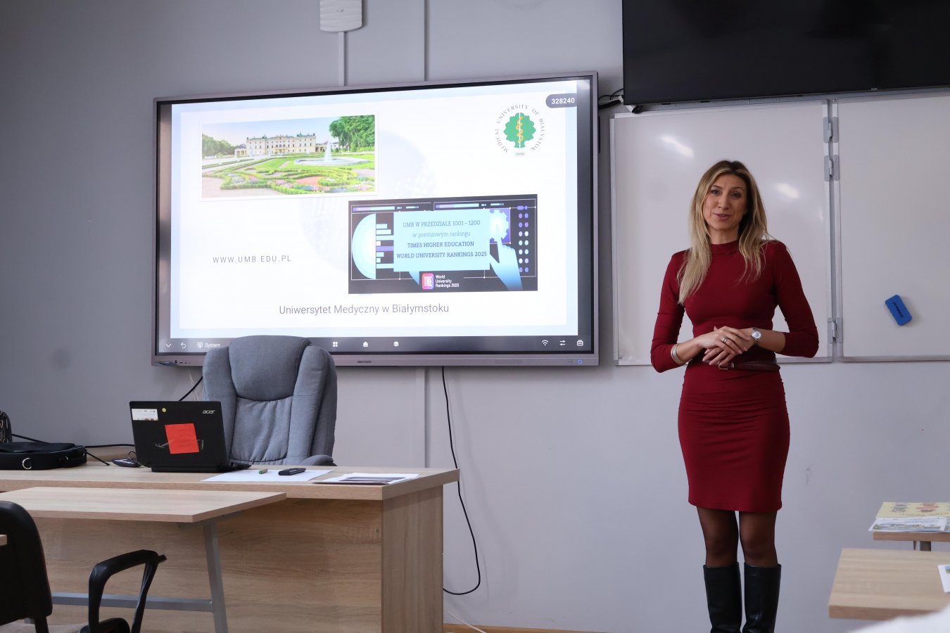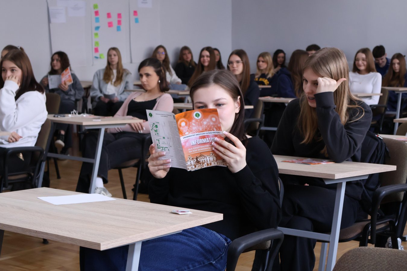Z kolei mgr Urszula Jasiulewicz przybliżyła uczniom m.in. zasady rekrutacji na studia, formy wsparcia studentów w procesie kształcenia oraz inne aktywności studenckie realizowane na UMB. Studenci uczestniczący w spotkaniu podzielili się swoimi doświadczeniami, opowiadając o organizacjach studenckich oraz codziennym życiu studenta. Był również czas na zadawanie pytań przez uczniów i uczennice.