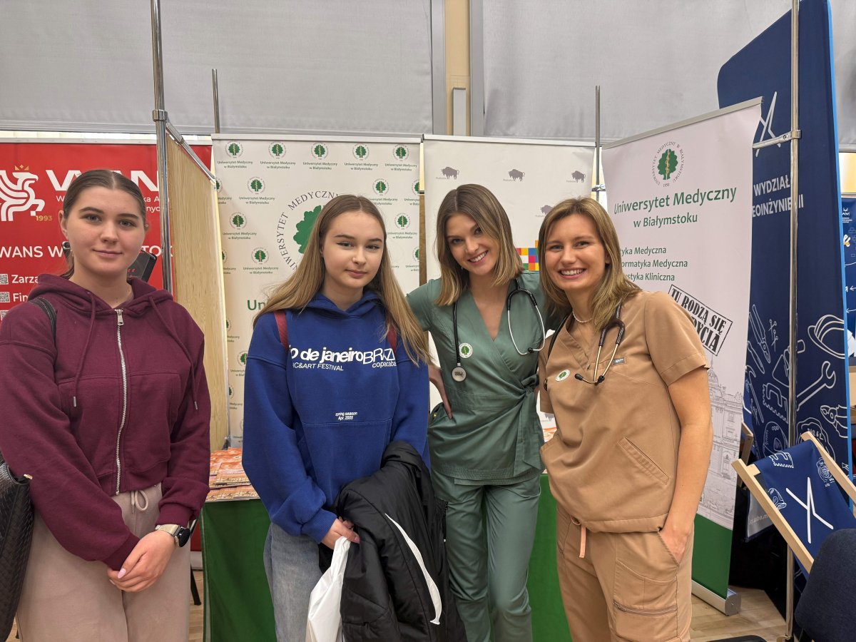 Podczas wydarzenia uczniowie mieli okazję porozmawiać o kierunkach studiów, zasadach rekrutacji oraz realiach studiowania na Uniwersytecie Medycznym w Białymstoku. Stoisko UMB cieszyło się dużym zainteresowaniem odwiedzających, szczególnie dzięki praktycznym elementom prezentacji. Studentki zaprezentowały działanie stetoskopu, umożliwiając uczestnikom odsłuchanie pracy serca oraz przybliżając jedno z podstawowych narzędzi wykorzystywanych w pracy lekarza.