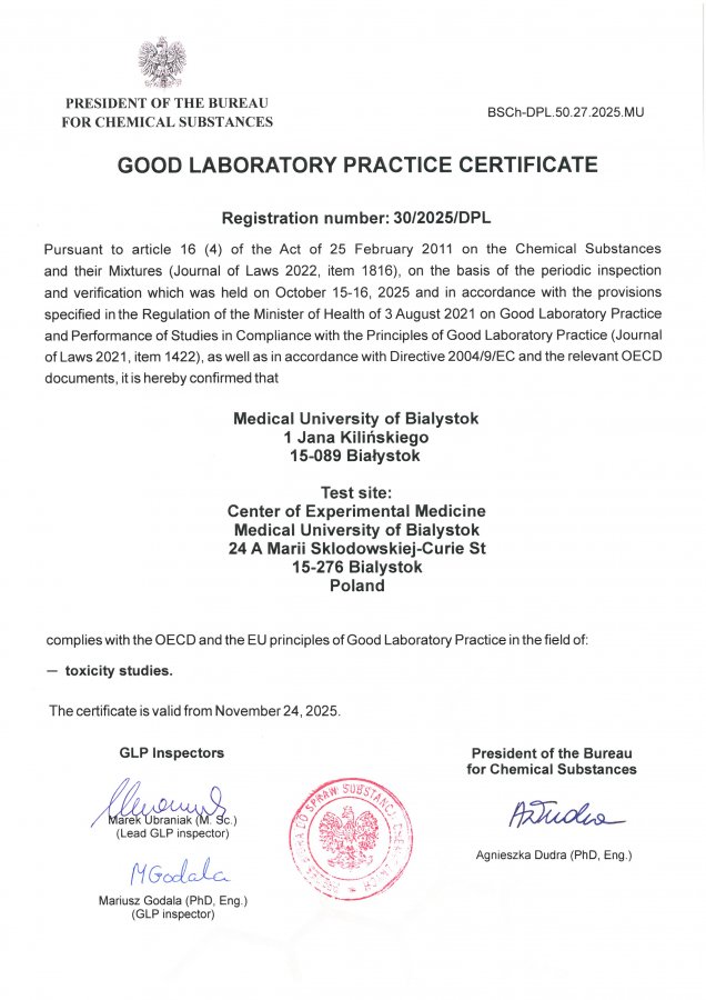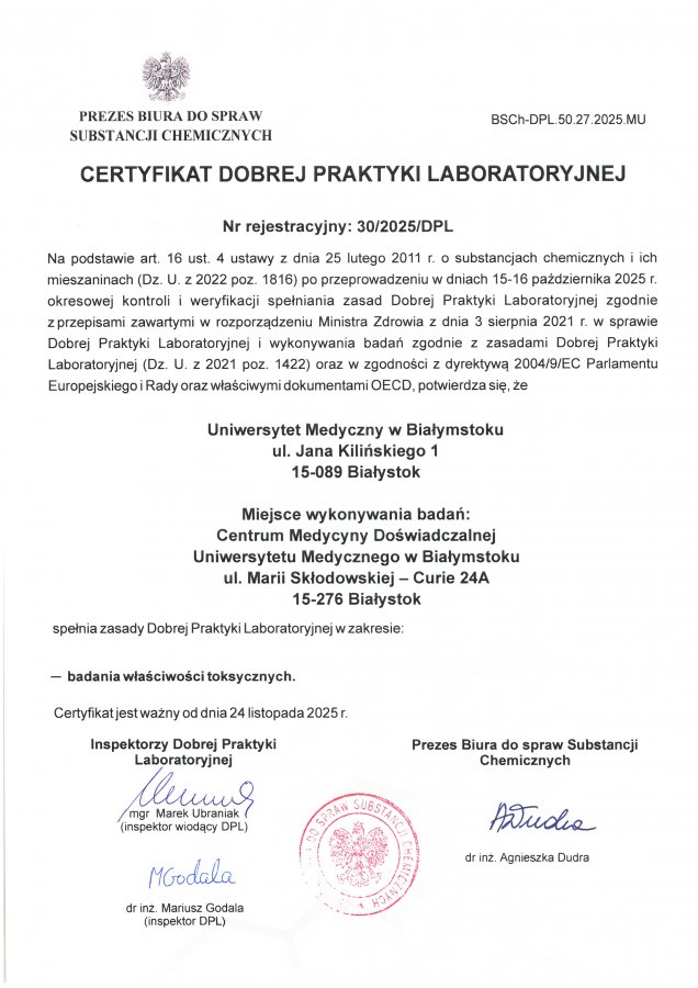 Centrum Medycyny Doświadczalnej od roku 2012 uzyskało Certyfikat Zgodności z Zasadami Dobrej Praktyki Laboratoryjnej w zakresie: