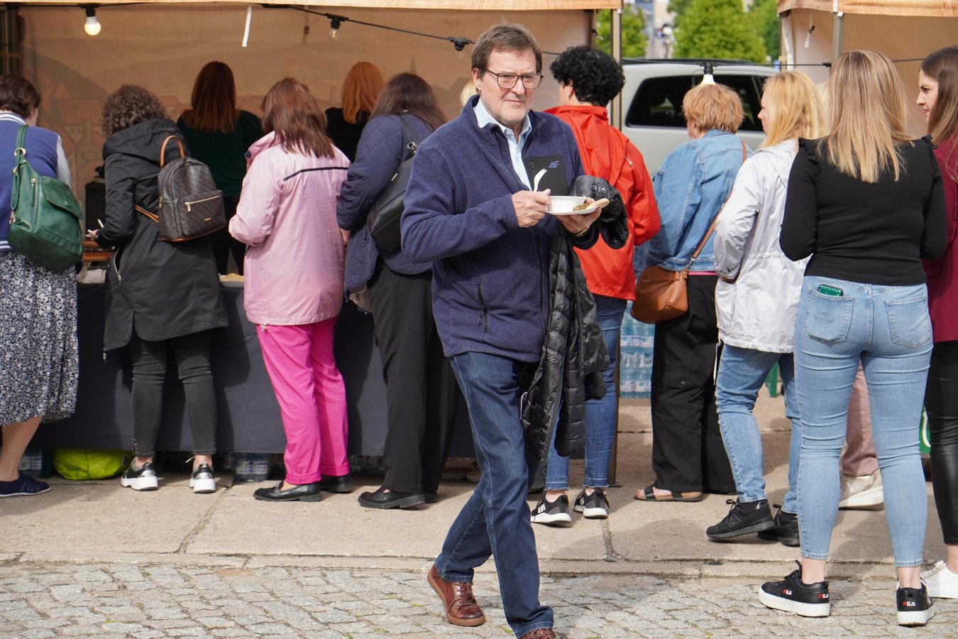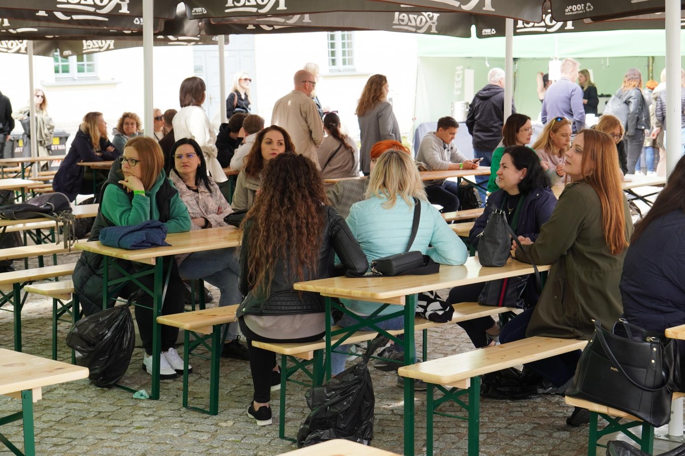 - Po prawej stronie od wejścia głównego umieszczony będzie ogródek gastronomiczny oraz oświetlony namiot z miejscami do siedzenia, w tym jednej stolik przy wejściu zarezerwowany dla osób z niepełnosprawnością.