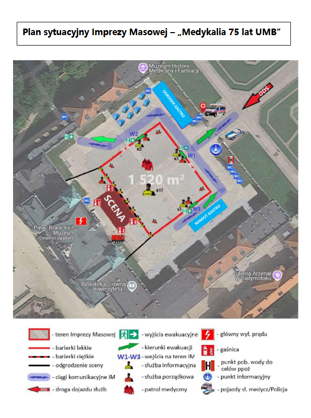 Plan graficzny Imprezy Masowej, na którym zaznaczono M.IN. rozmieszczenie dróg i wyjść ewakuacyjnych, lokalizację sceny i pracowników ochrony.