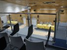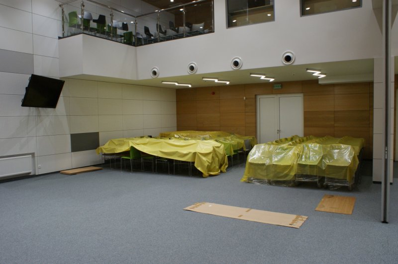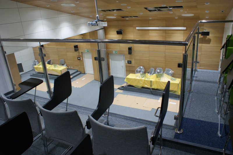 Bardzo ciekawie zaaranżowano aulę wykładową, która na dwóch poziomach (!) może zmieścić 160 słuchaczy. Kiedy jest potrzeba można rozłożyć składaną ścianę i zyskać dwie sale mieszczące po 80 osób (podobne rozwiązania stosowane są na Wydziale Nauk o Zdrowiu). Sale mają specjalne pomieszczenia dla tłumaczy.
