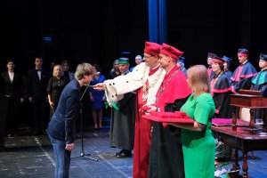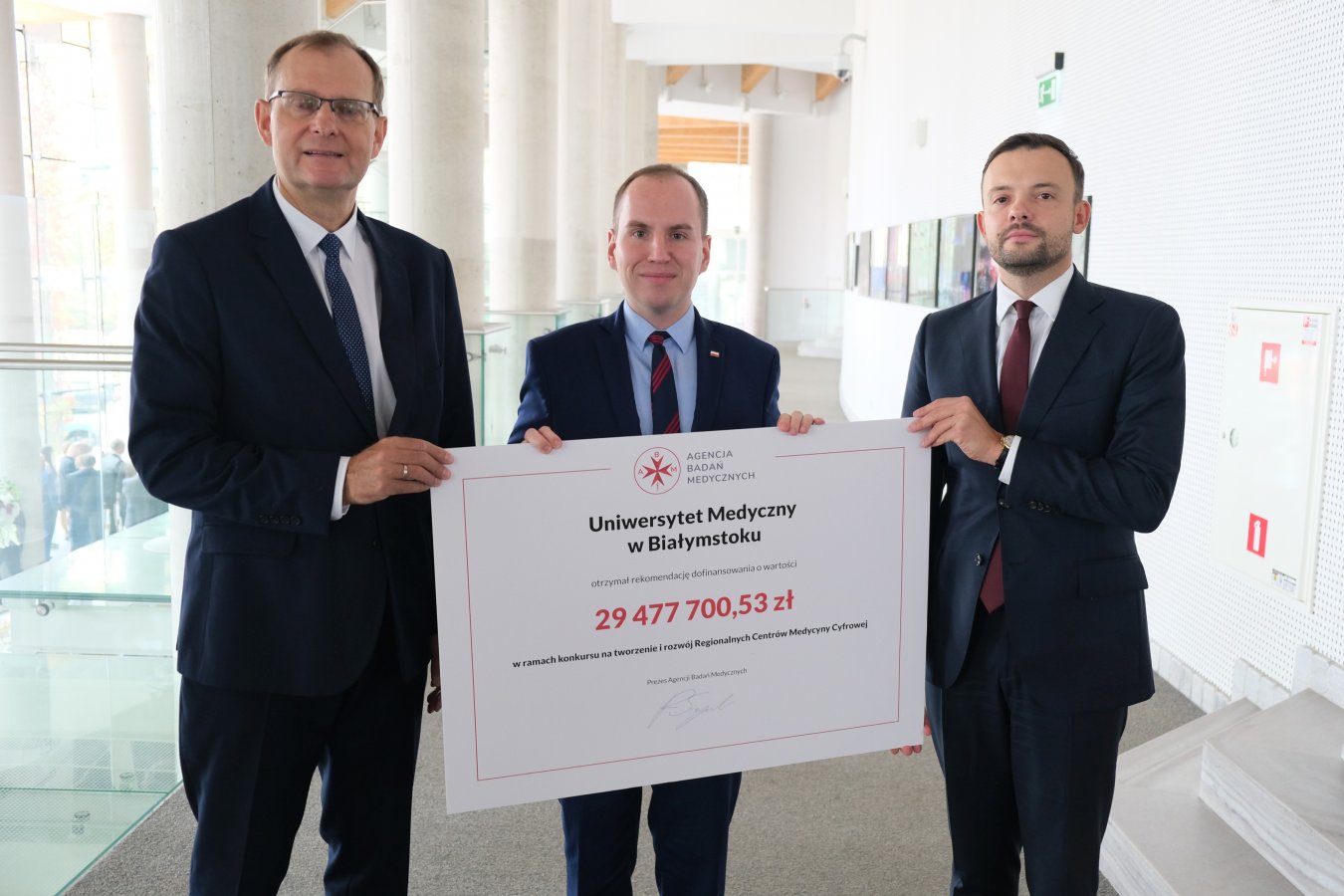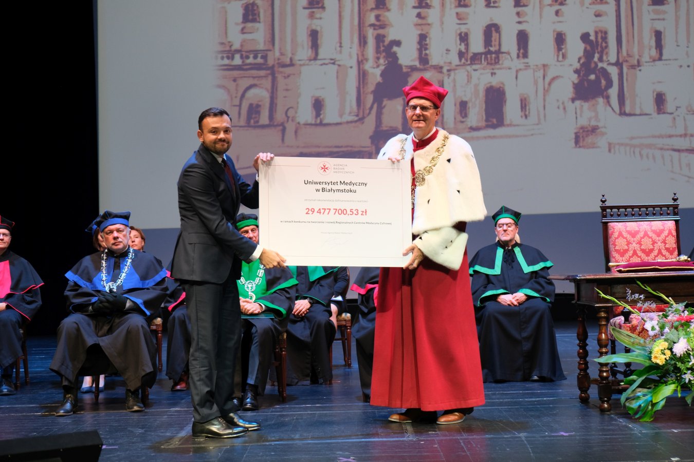 Obecny podczas inauguracji prezes Agencji Badań Medycznych, dr hab. Radosław Sierpiński wręczył władzom Uczelni symboliczny czek – na kwotę blisko 30 mln złotych, który sfinansuje powstanie na UMB Centrum Medycyny Cyfrowej.