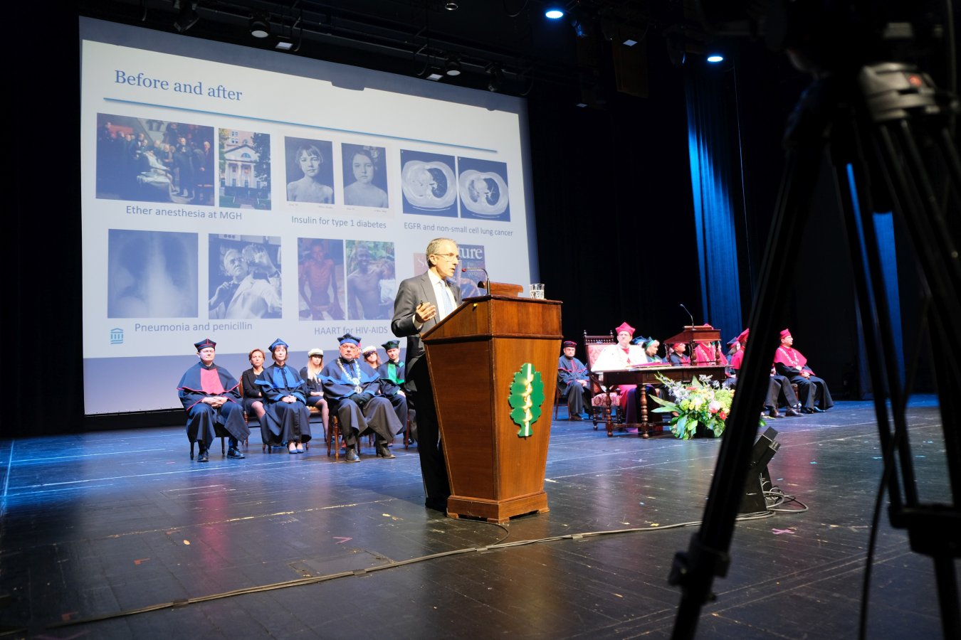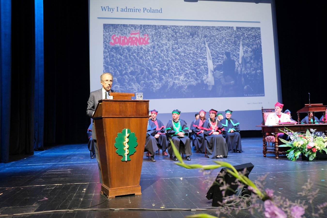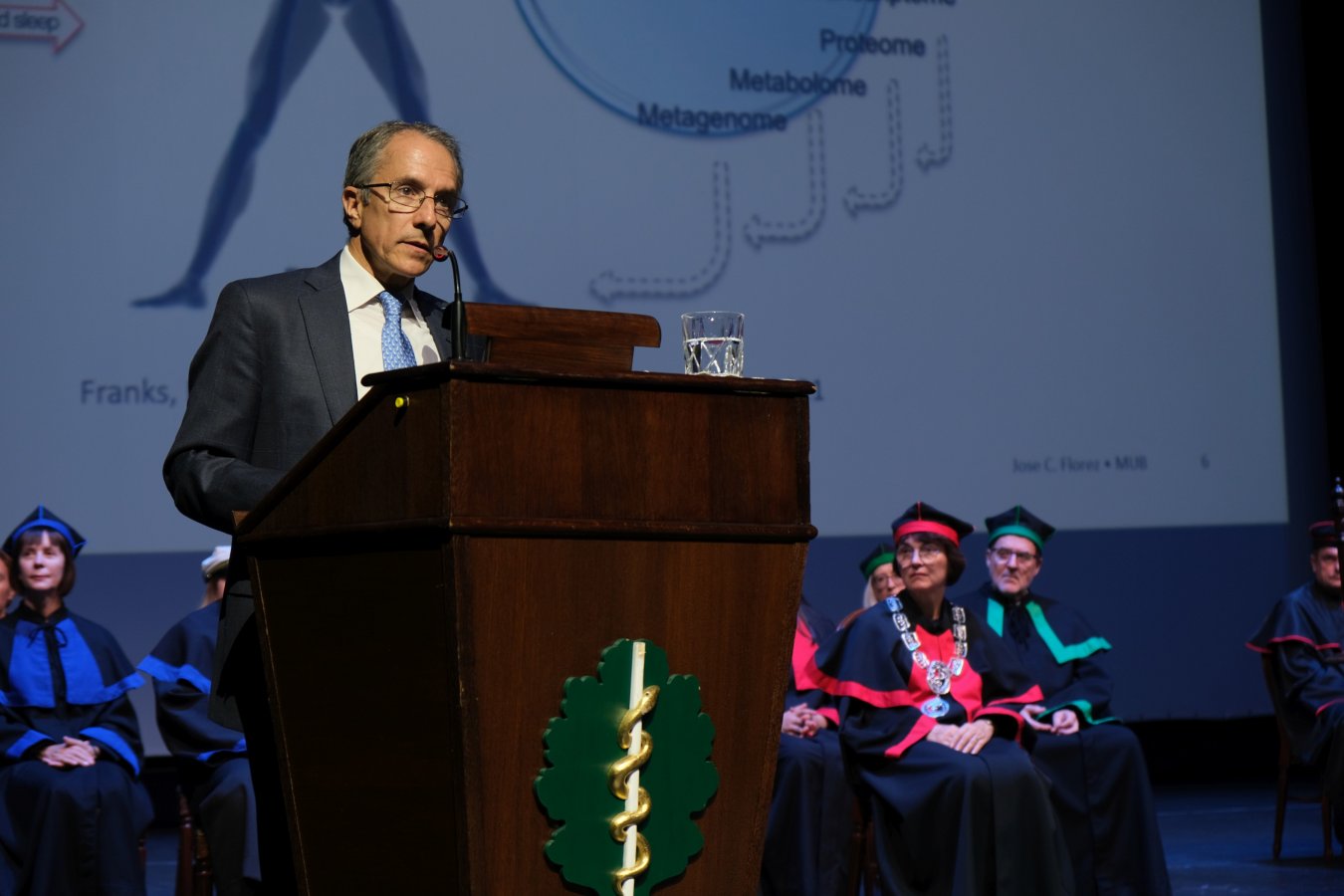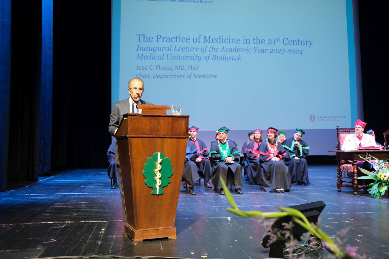Wykład inauguracyjny pt. „The practice of medicine in the 21st century” na zaproszenie JM Rektora wygłosił prof. Jose Florez, Główny Lekarz i Kierownik Wydziału Medycyny w Massachusetts General Hospital (MGH) w Bostonie, profesor medycyny klinicznej w Harvard Medical School. Gość ze Stanów Zjednoczonych jest także członkiem instytutu w Broad Institute of MIT i Harvard, gdzie aktywnie uczestniczy w programie Genetyki Medycznej i Populacyjnej. Jako kierownik katedry w MGH nadzoruje 10 oddziałów klinicznych, siedem jednostek/centrów badawczych oraz 19 programów szkoleniowych, w których uczestniczy ponad 1000 pracowników naukowych, 900 stażystów (stypendystów klinicznych, badaczy i rezydentów medycznych) oraz 100 praktyk lekarskich. W trakcie swojej kariery badawczej on i jego zespół wnieśli wkład w prowadzenie i analizę wysokowydajnych badań genomicznych nad cukrzycą typu 2 i pokrewnymi cechami w wielu międzynarodowych konsorcjach. Prof. J. Florez szczególnie interesuje się rozwojem medycyny precyzyjnej i farmakogenetyki w leczeniu cukrzycy. Jest członkiem mianowanym Amerykańskiego Towarzystwa Badań Klinicznych i Stowarzyszenia Lekarzy Amerykańskich oraz laureatem prezydenckiej nagrody Early Career Award 2010 dla naukowców i inżynierów, najwyższego wyróżnienia nadawanego przez rząd Stanów Zjednoczonych specjalistom w dziedzinie nauki i inżynierii w na wczesnych etapach ich niezależnej kariery badawczej.