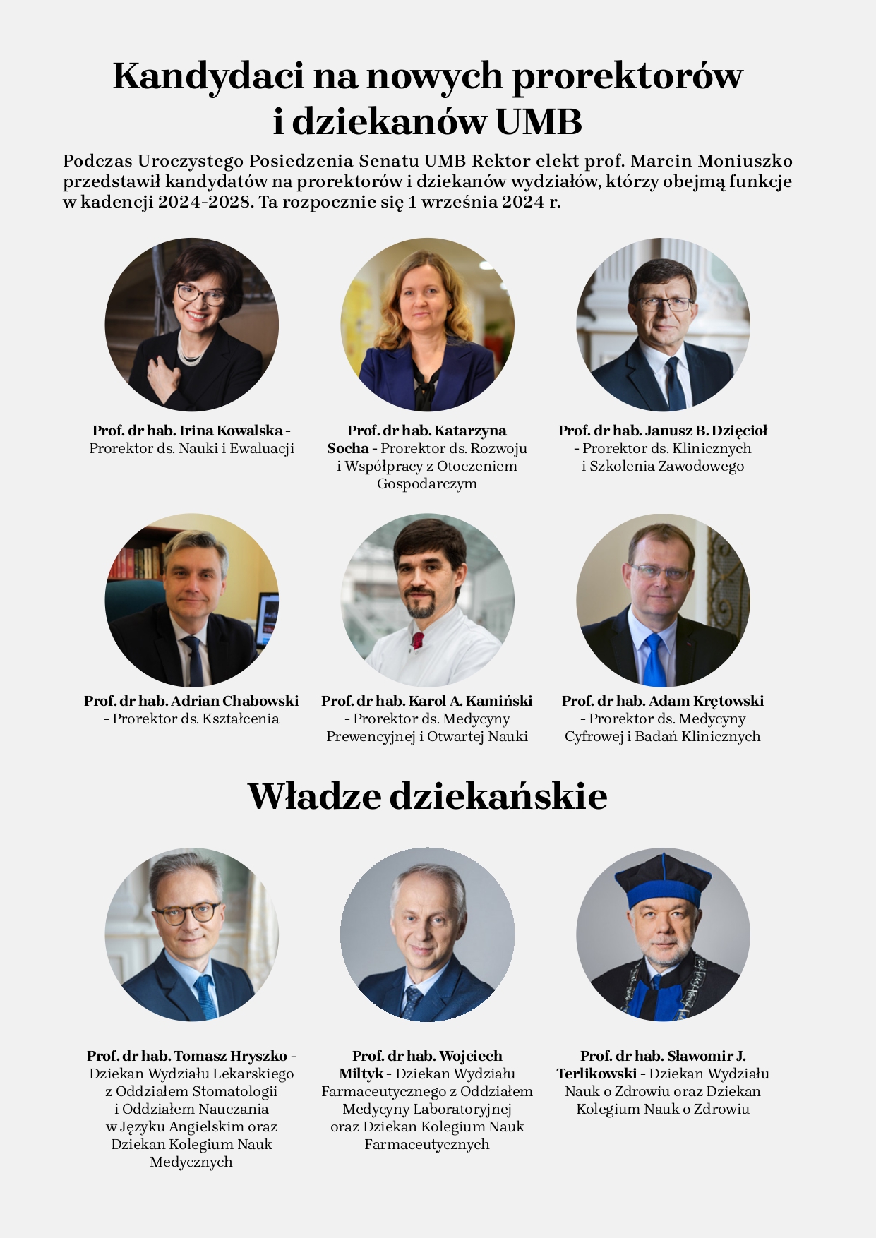 Podczas Uroczystego Posiedzenia Senatu UMB Rektor elekt prof. Marcin Moniuszko przedstawił kandydatów na prorektorów i dziekanów wydziałów, którzy obejmą funkcje w kadencji 2024-2028. Ta rozpocznie się 1 września 2024 r.