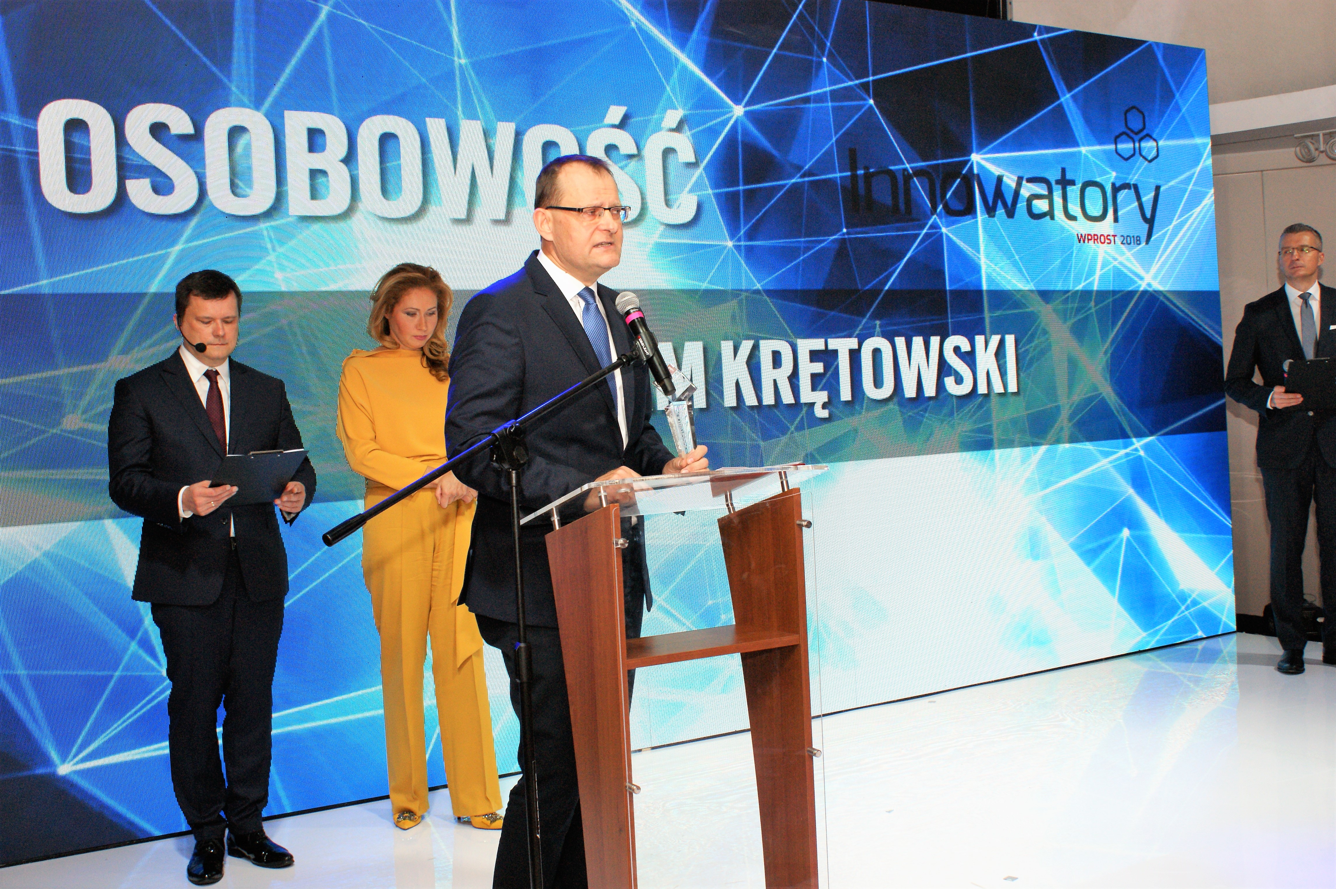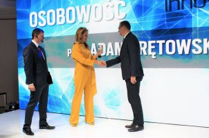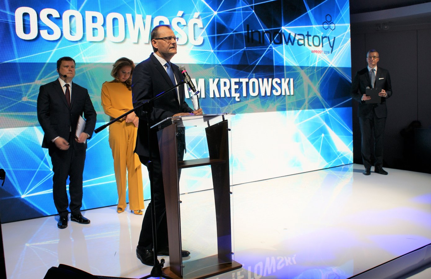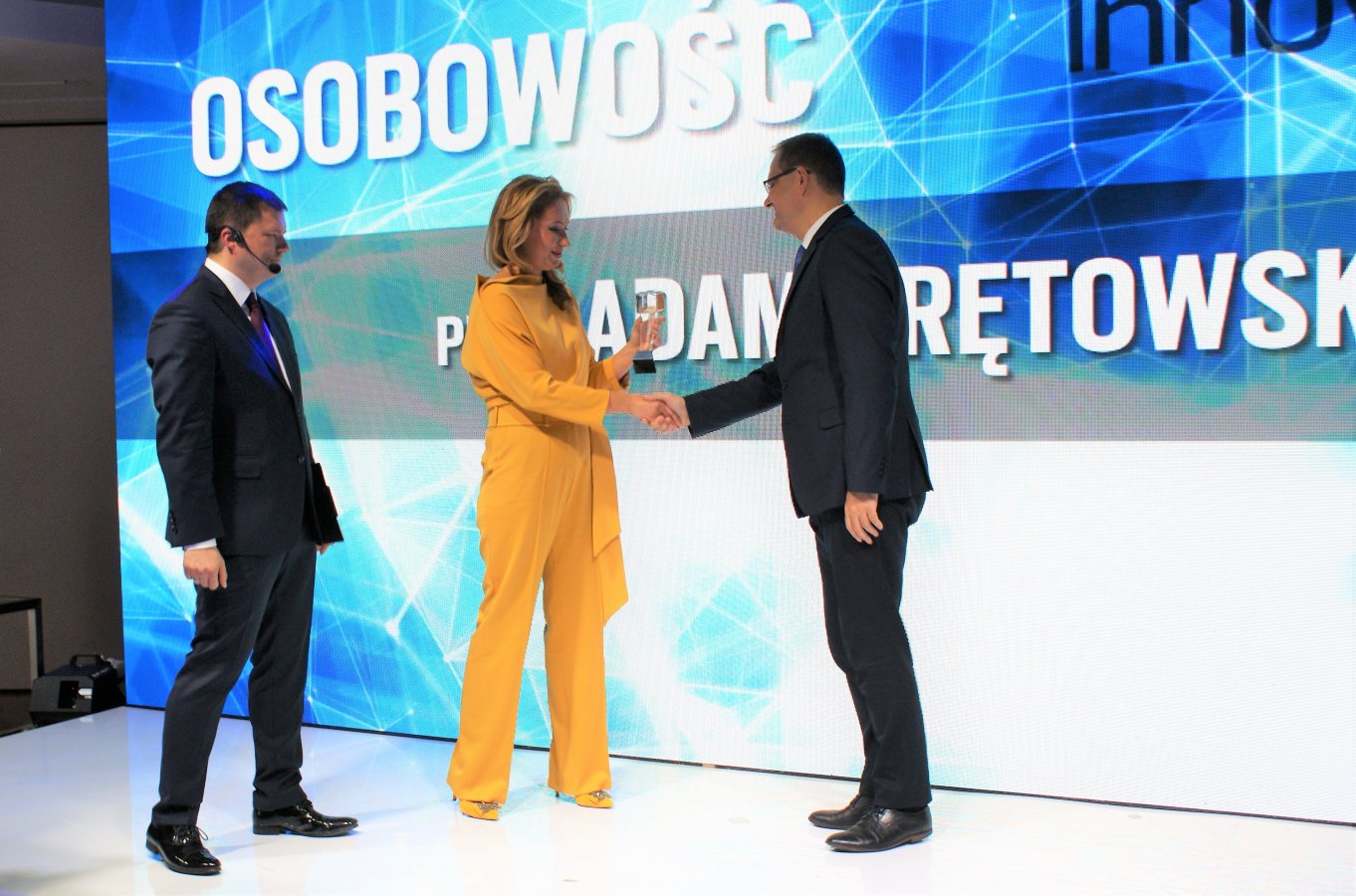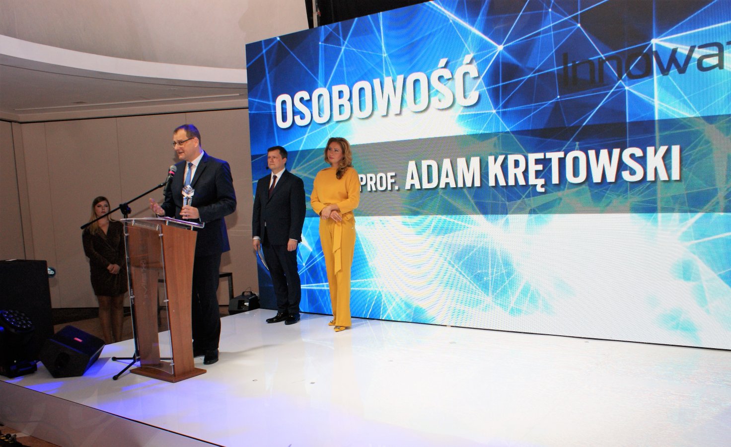 Rektor UMB prof. Adam Krętowski odebrał wyróżnienie w kategorii „Osobowość Innowacji”. Nagrodę wręczała Katarzyna Gintrowska, dyrektor generalna PMPG Polskie Media (właściciel tygodnika „Wprost”). W wygłoszonej laudacji przywołała powstałe na naszej uczelni nowatorskie jednostki badawcze (Centrum Badań Innowacyjnych oraz Centrum Badań Klinicznych), a także najważniejsze realizowane tu projekty naukowe, m.in. te dotyczące medycyny spersonalizowanej, badania nad ludzkim genomem czy te dotyczące lepszego poznania przyczyn chorób cywilizacyjnych. Jak przyznała dyrektor Gintrowska wielkie wrażenie zrobił na niej pomysł stworzenia w Białymstoku Centrum Sztucznej Inteligencji w Medycynie oraz fakt, że premier Mateusz Morawiecki obiecał grant w wysokości 50 mln zł na jego wsparcie.