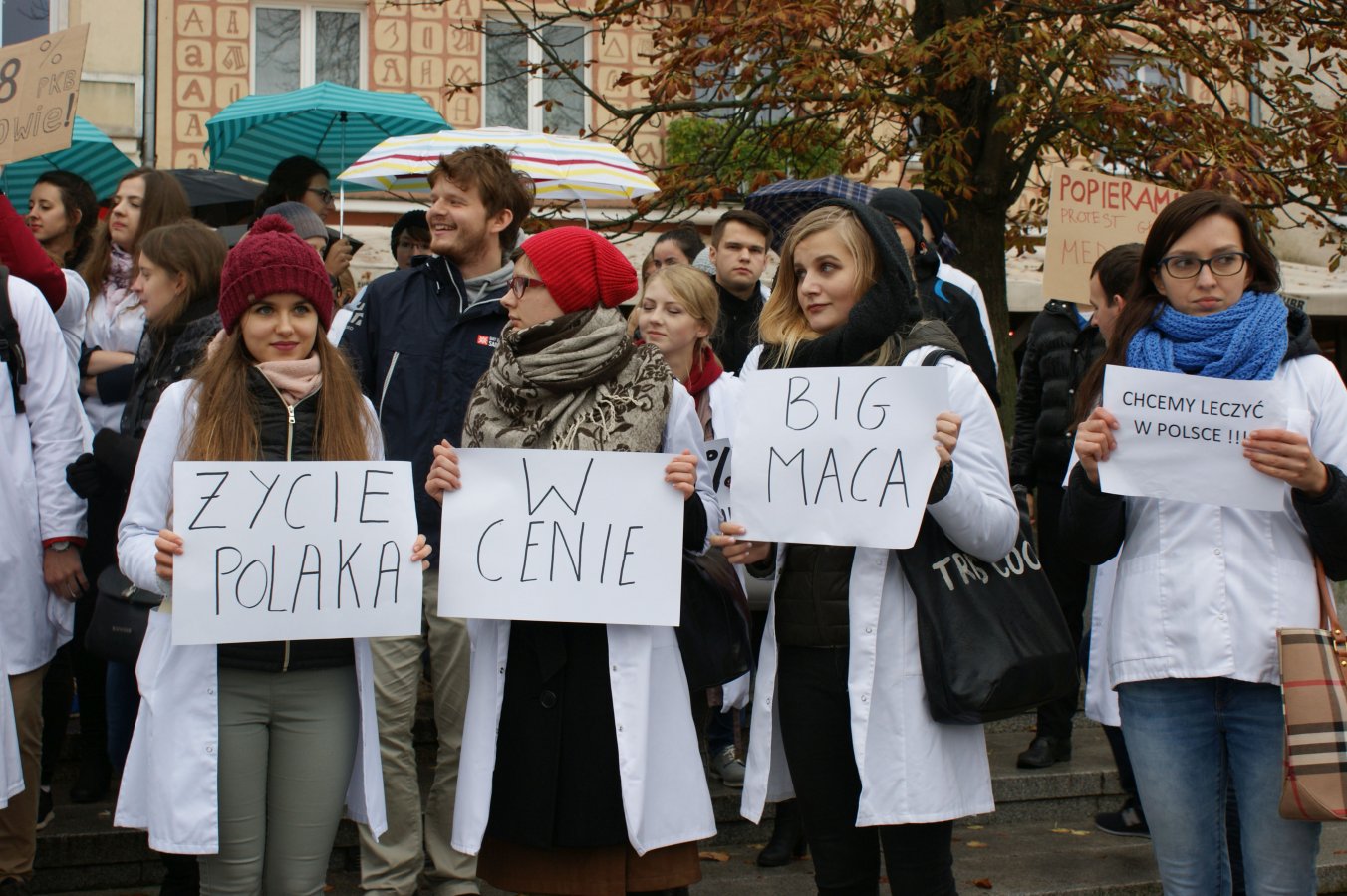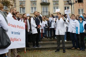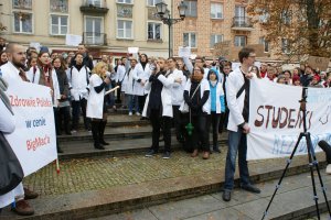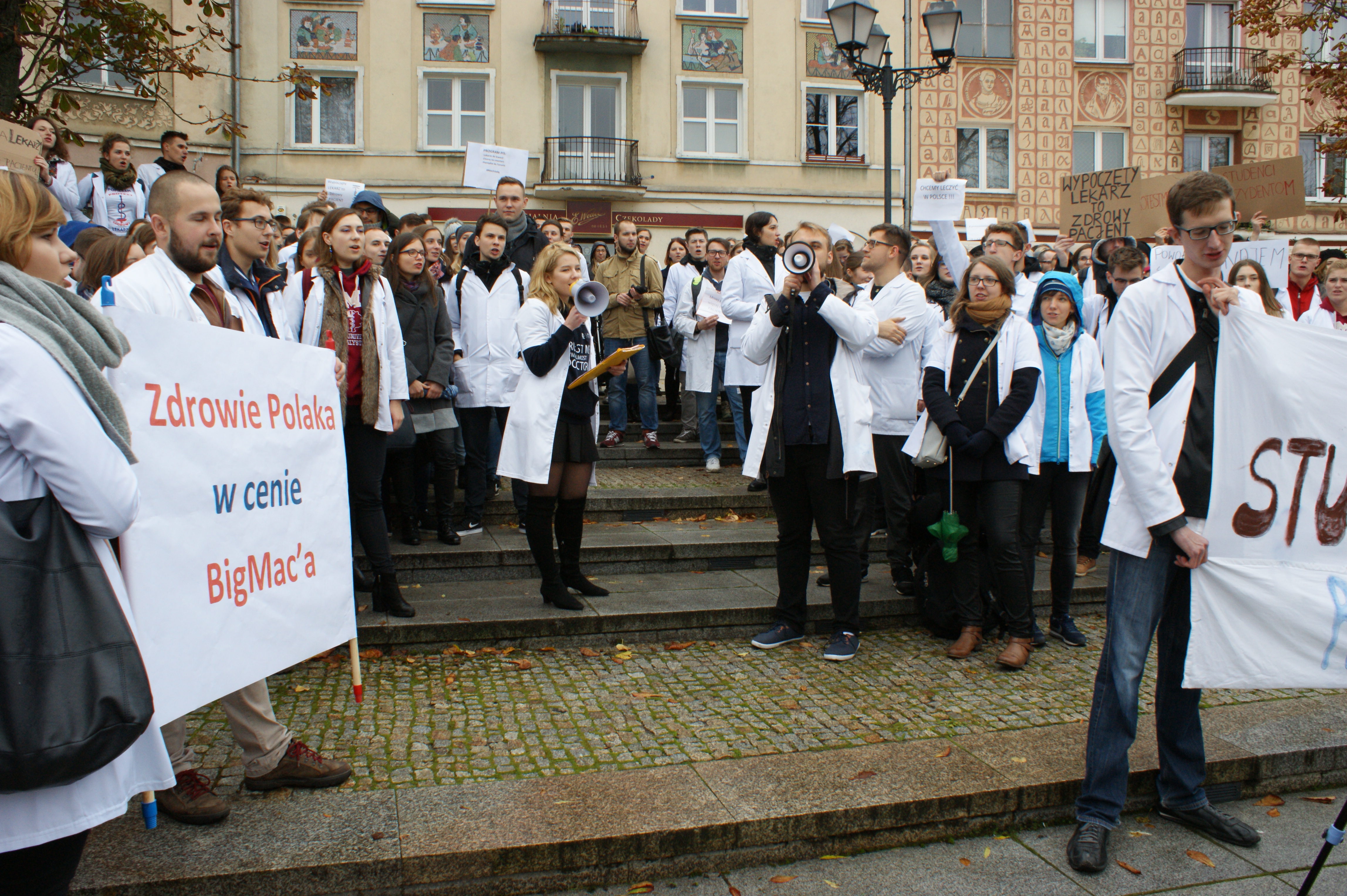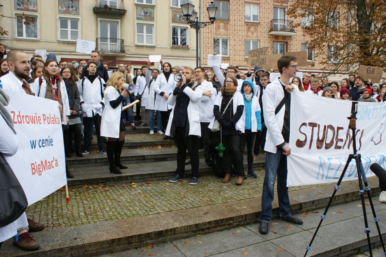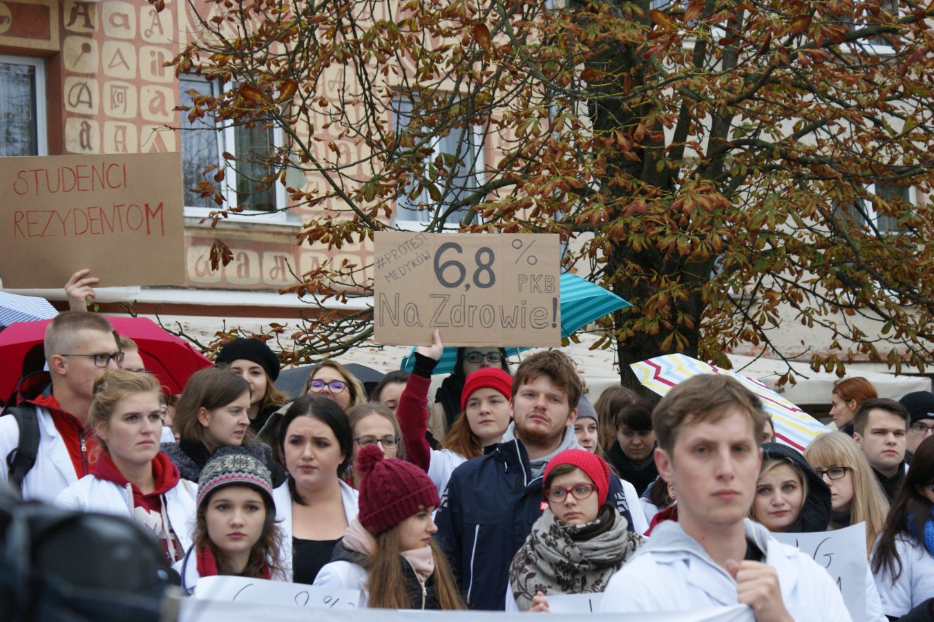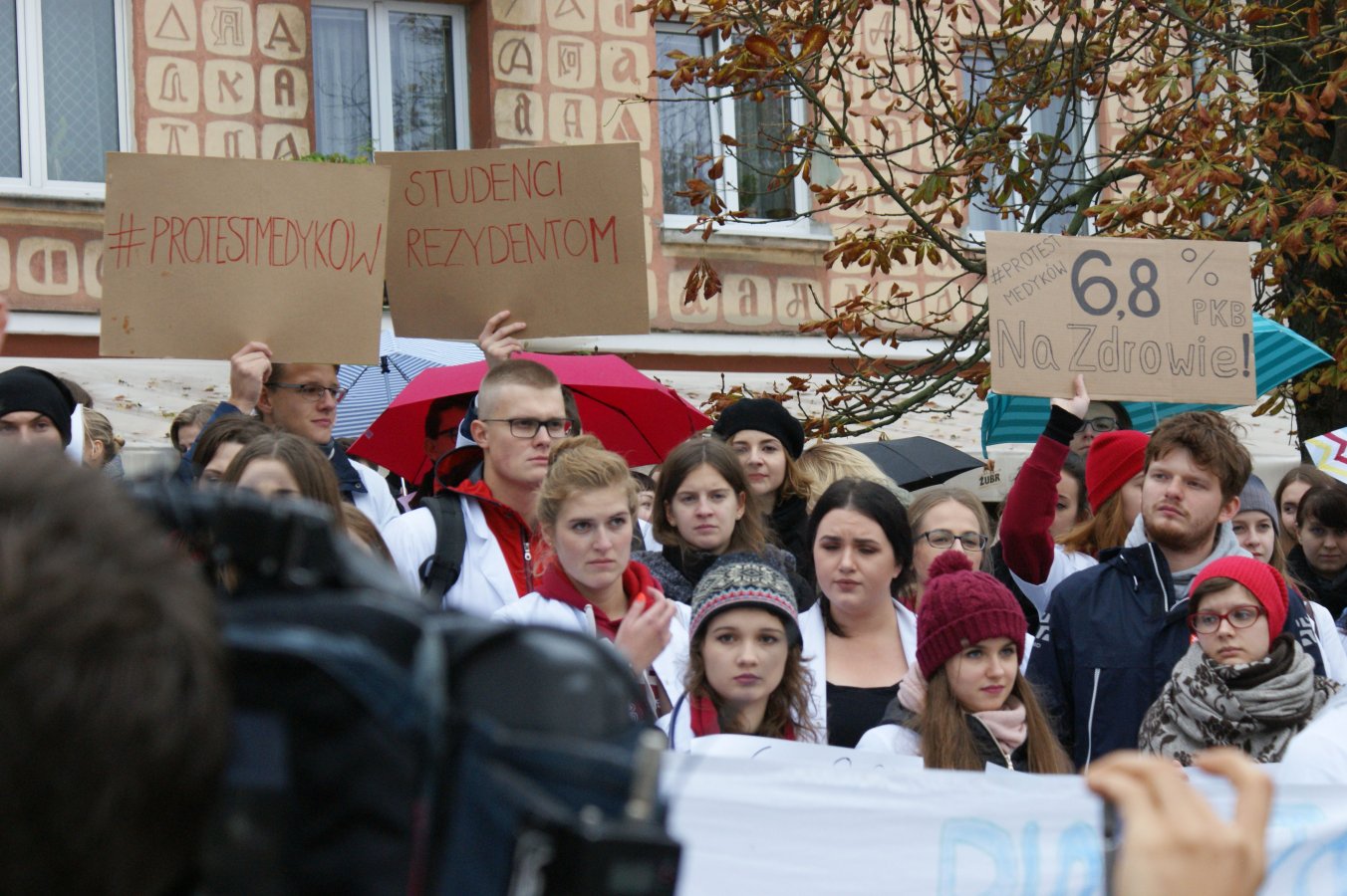 Na placu przed ratuszem zebrało się kilkuset młodych ludzi. Ubrani byli w białe fartuchy. W rękach trzymali transparenty i kartony z wypisanymi hasłami i postulatami protestujących. Ten główny był taki sam jak w Warszawie: 6,8 proc. PKB przeznaczane z budżetu państwa na służbę zdrowia w ciągu najbliższych trzech lat. Obecnie to 4,7 proc. PKB.