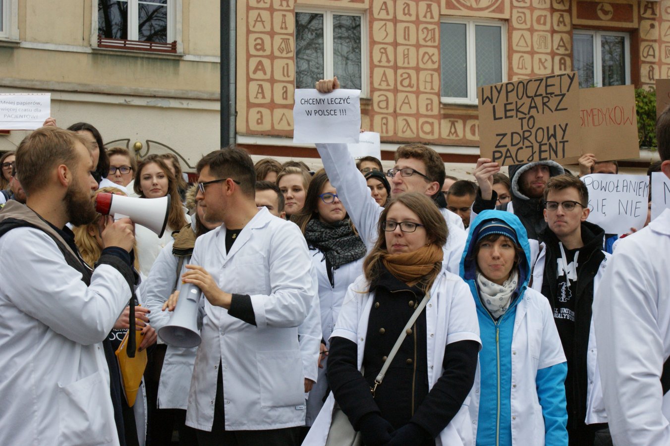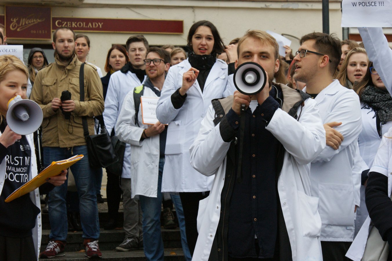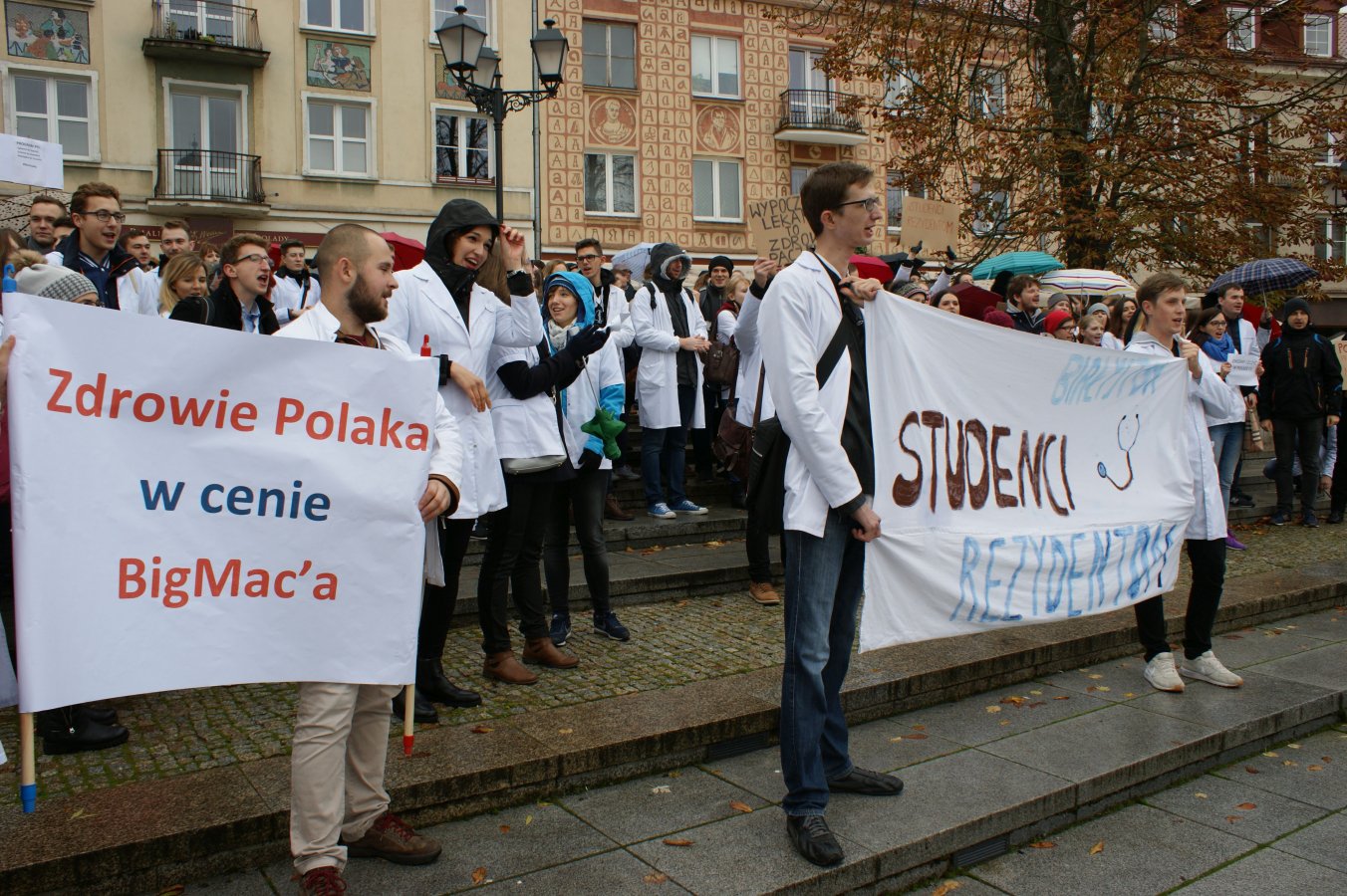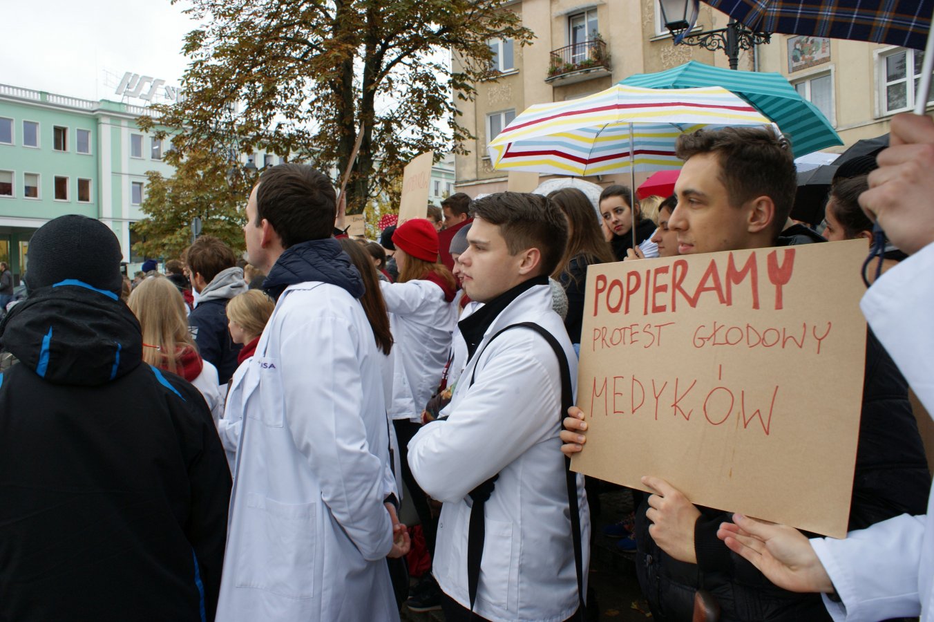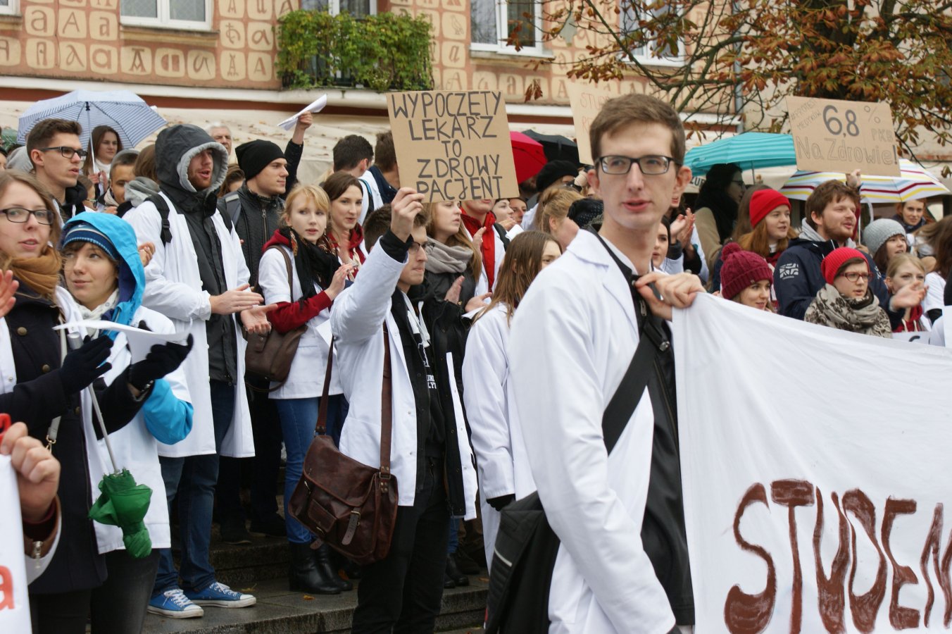 Na placu przed ratuszem zebrało się kilkuset młodych ludzi. Ubrani byli w białe fartuchy. W rękach trzymali transparenty i kartony z wypisanymi hasłami i postulatami protestujących. Ten główny był taki sam jak w Warszawie: 6,8 proc. PKB przeznaczane z budżetu państwa na służbę zdrowia w ciągu najbliższych trzech lat. Obecnie to 4,7 proc. PKB.