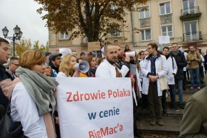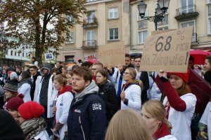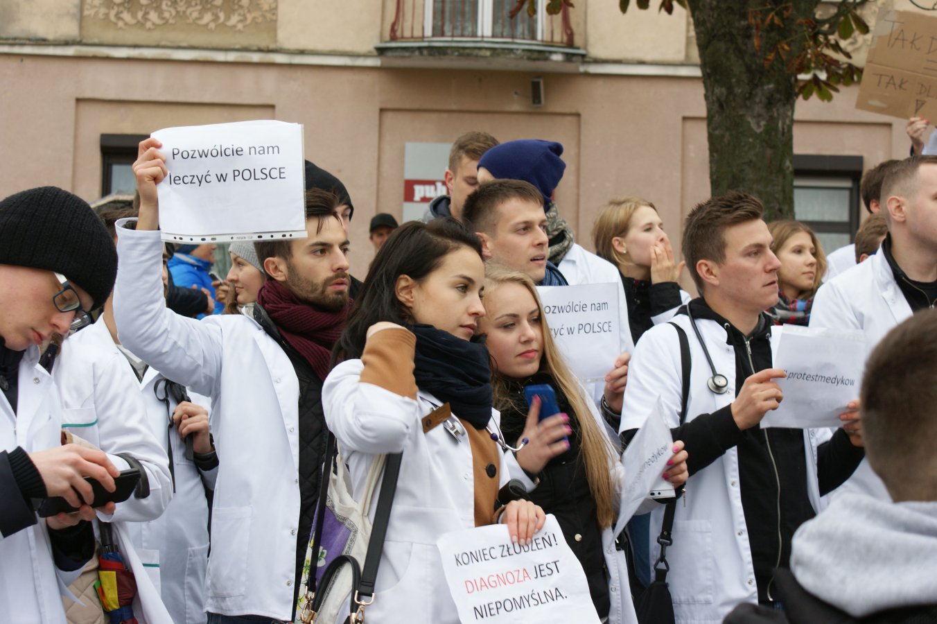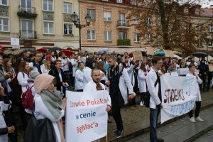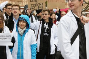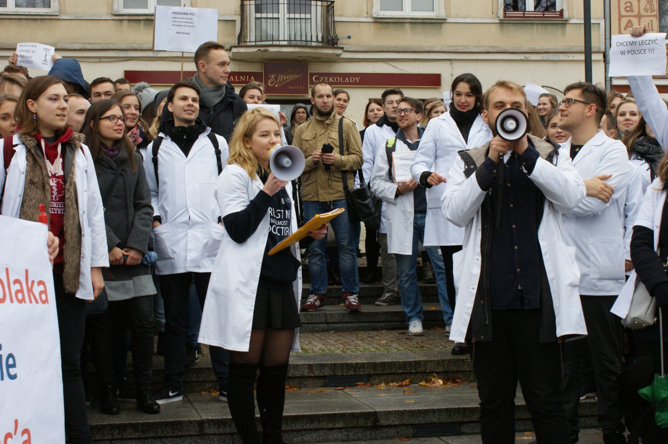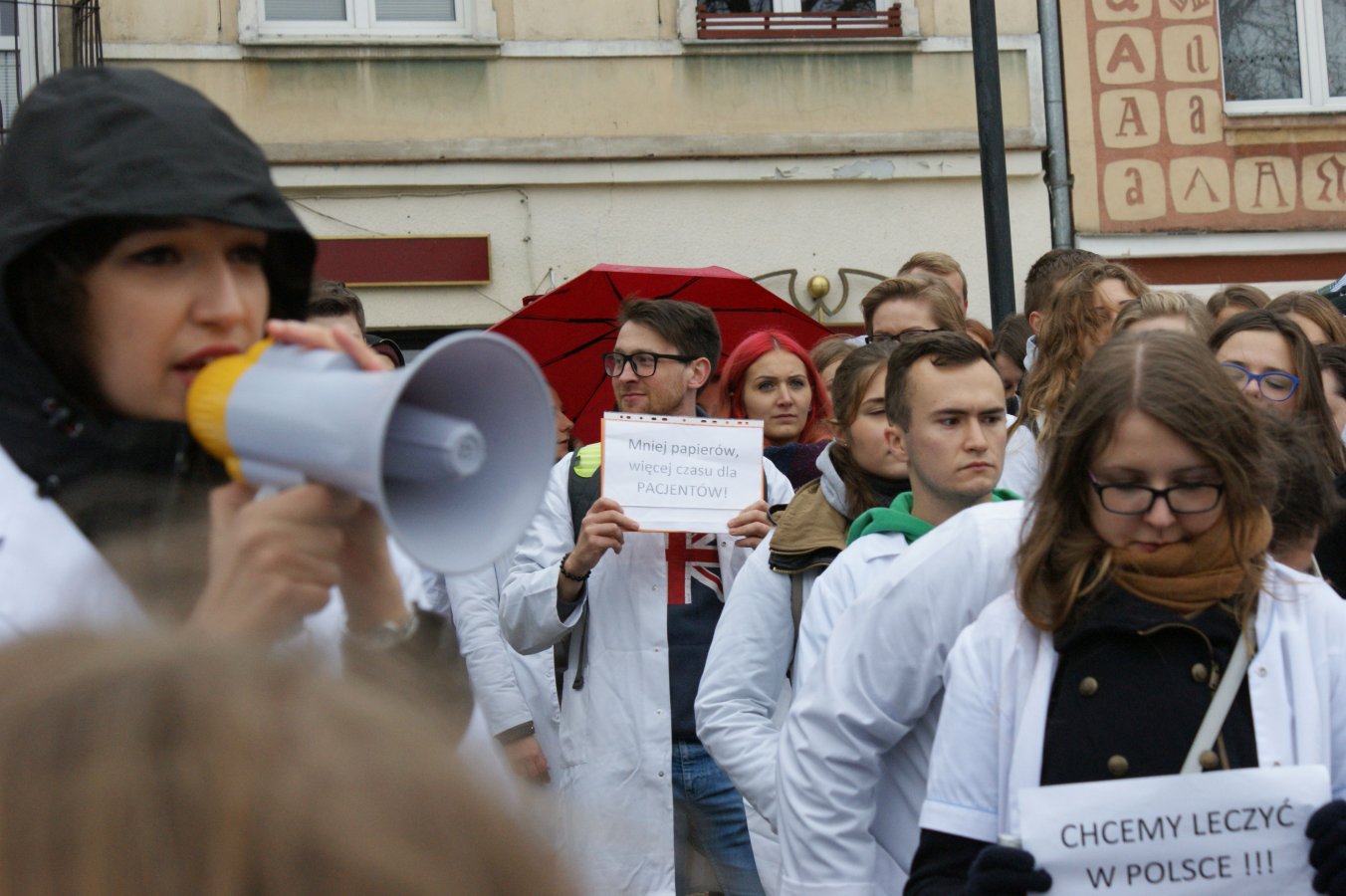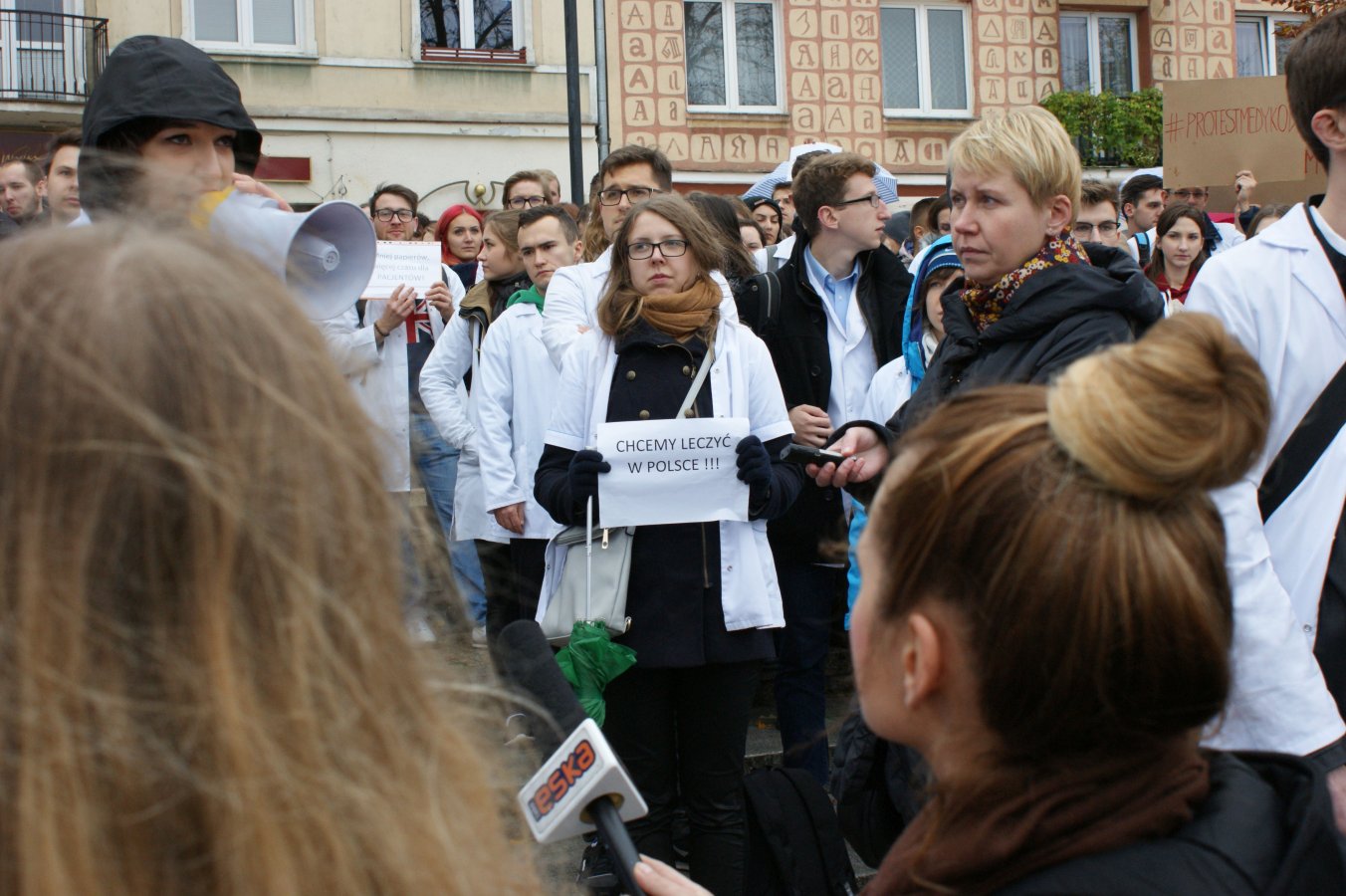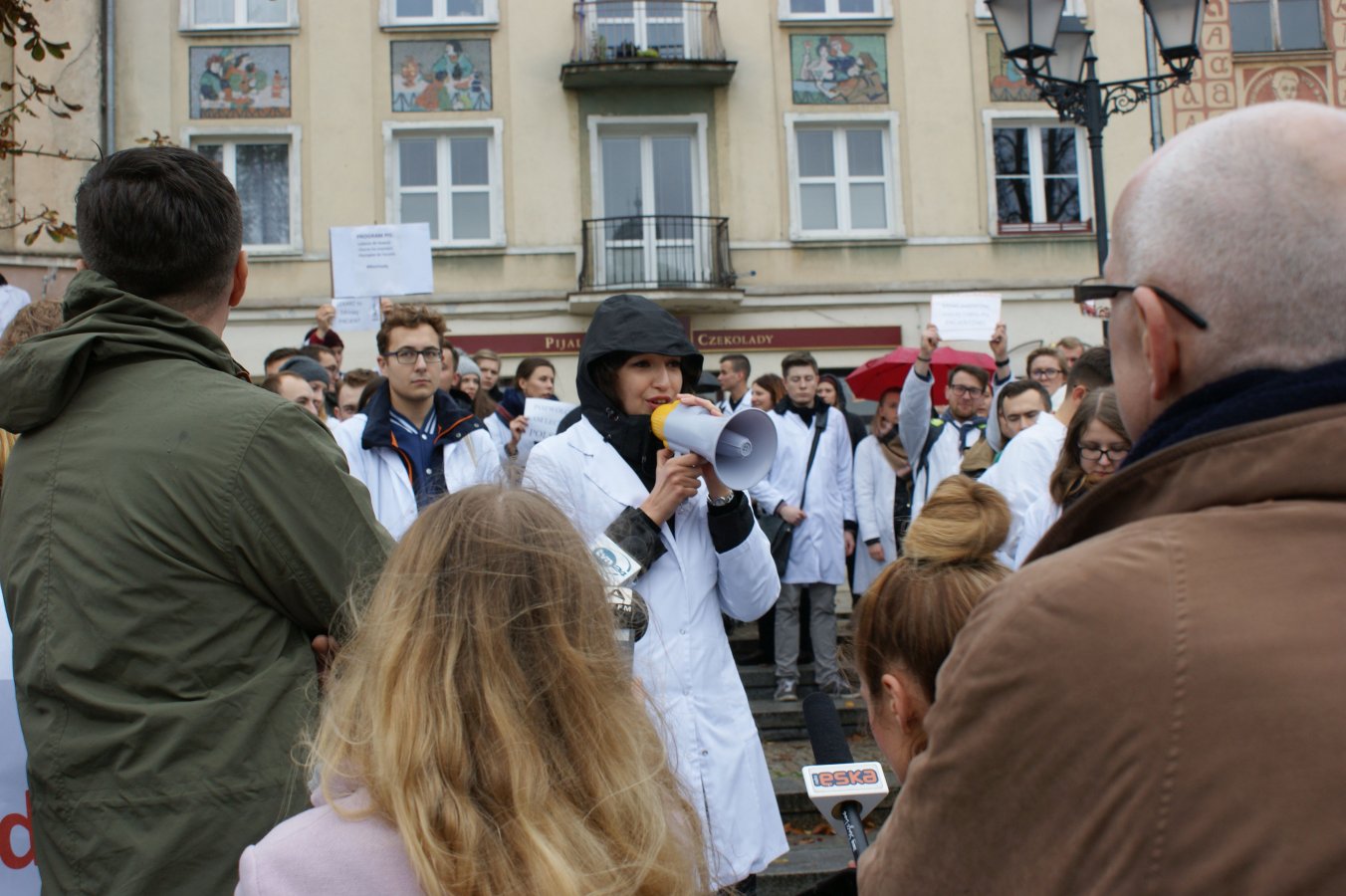 Na placu przed ratuszem zebrało się kilkuset młodych ludzi. Ubrani byli w białe fartuchy. W rękach trzymali transparenty i kartony z wypisanymi hasłami i postulatami protestujących. Ten główny był taki sam jak w Warszawie: 6,8 proc. PKB przeznaczane z budżetu państwa na służbę zdrowia w ciągu najbliższych trzech lat. Obecnie to 4,7 proc. PKB.