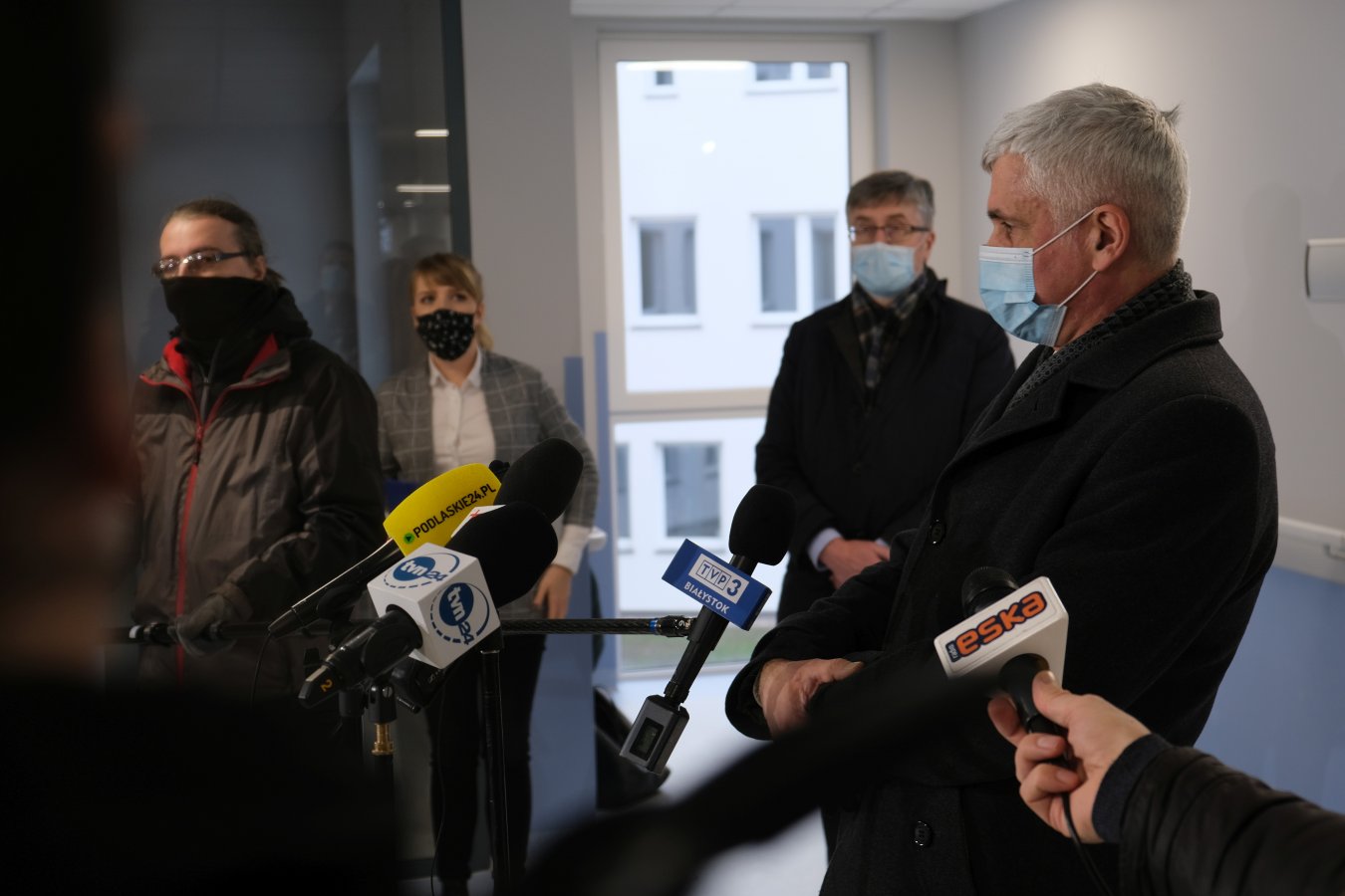 20 listopada szpital w hali UMB wizytował wojewoda podlaski Bohdan Paszkowski oraz dyrektor szpitala USK dr hab. Jan Kochanowicz. Obiekt ten w sensie budowlanym był już praktycznie skończony. Powstały specjalne boksy dla pacjentów, wszystkie instalacje, izba przyjęć, gabinety zabiegowe oraz pomieszczenia socjalne dla załogi placówki. Kilka dni po wizytacji zaplanowano jeszcze montaż zewnętrznego zbiornika z tlenem. Jak zaznaczył wojewoda prace związane z wyposażeniem hali w sprzęt z Agencji Rezerw Materiałowych mają się rozpocząć od 27 listopada.