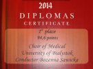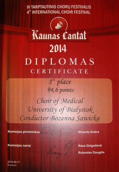 Chór Uniwersytetu Medycznego w Białymstoku, pod dyrekcją profesor Bożenny Sawickiej, zajął I miejsce podczas 4th International Choir Festival KAUNAS CANTAT, który odbył się w dniach 16-18 maja 2014 roku w Kownie na Litwie. W festiwalu brały udział chóry z Litwy, Łotwy, Estonii oraz Polski.
