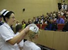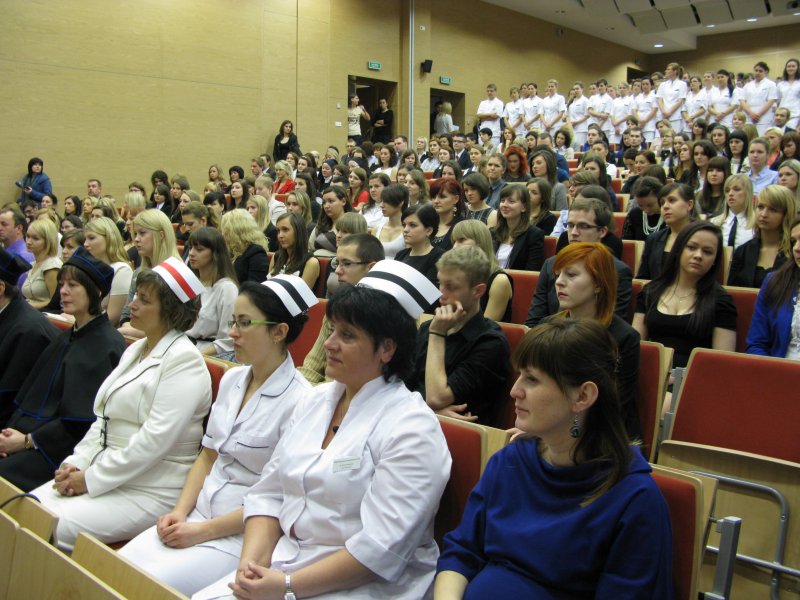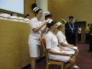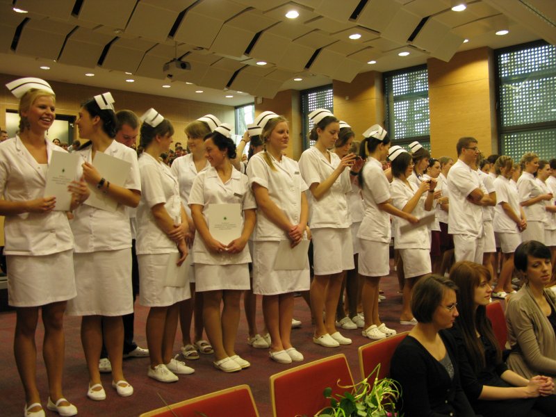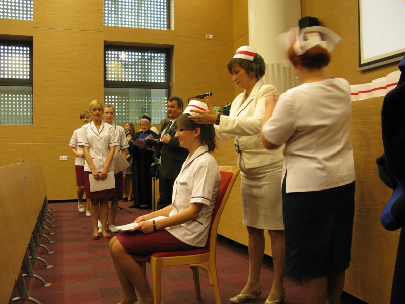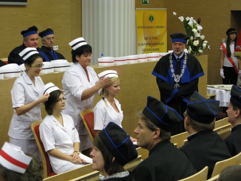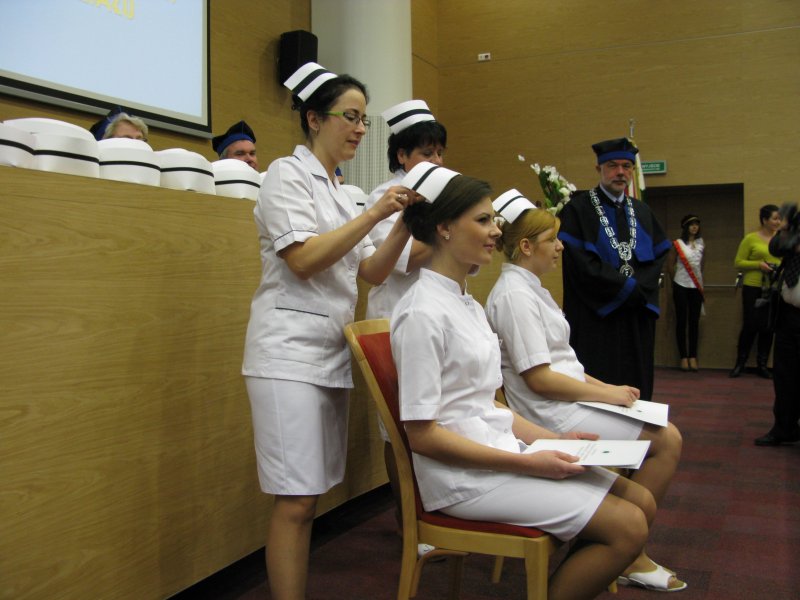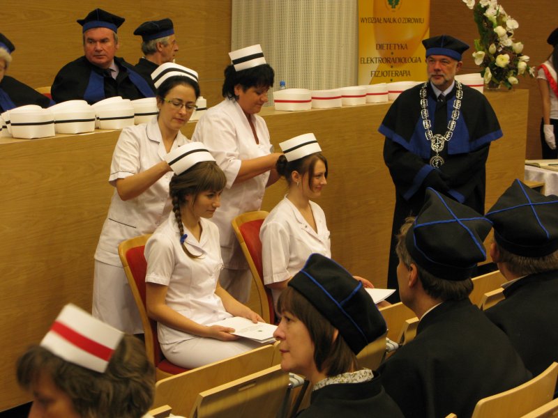 Wydziałowe uroczystości składały się z dwóch części. Najpierw studentkom II roku pielęgniarstwa i położnictwa ich nauczyciele nakładali czepki na głowę (panowie pielęgniarze czepek dostawali do ręki). Czarny pasek na czepku oznacza pielęgniarkę, czerwony - położną. Czepek, który otrzymuje student różni się od czepka "zawodowego" szerokością paska, pracująca zawodowo pielęgniarka ma szeroki pasek natomiast student ma pasek wąski.