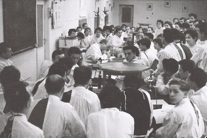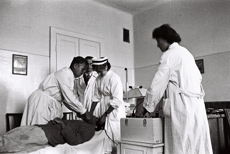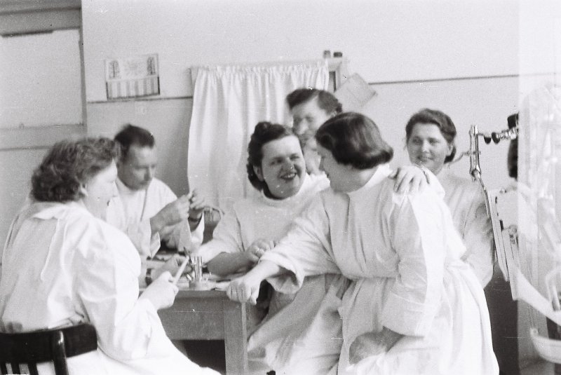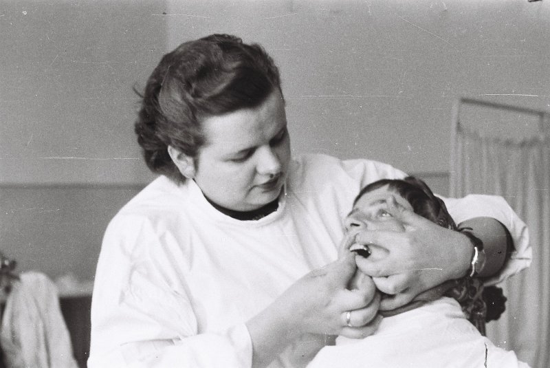 - Są zdjęcia ze szpitali, z pracowni protetycznych, pracowni rentgenowskiej – mówi Dąbrowski. – Stosunkowo niedużo jest zdjęć z studentami, ale z drugiej strony są one bardzo ciekawe, charakterystyczne. Kilka rolek to stricte dokumentacja medyczna. Na jednym jest uwiecznione dziecko z wadami postawy, na innym z chorobą genetyczną. Na kolejnym prof. Wiktor Hassmann przeprowadza badanie laryngologiczne. Na jeszcze innym widać prof. Witolda Sławińskiego podczas wykładu. Są też zdjęcia pokazujące życie codziennie w szpitalach, choćby lekarzy na przerwie przy herbacie.