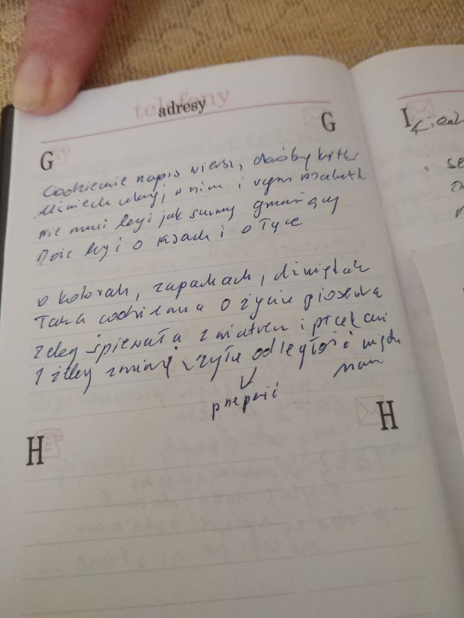 - Wiersze tworzę tak jak wcześniej, najpierw zapisuję pomysły na karteczkach czy w kalendarzykach. Widzę coś za oknem autobusu, w głowie pojawia się myśl i już jest pomysł na wiersz. Jak nie zapiszę tej myśli to wiersz nie powstanie - opowiada.