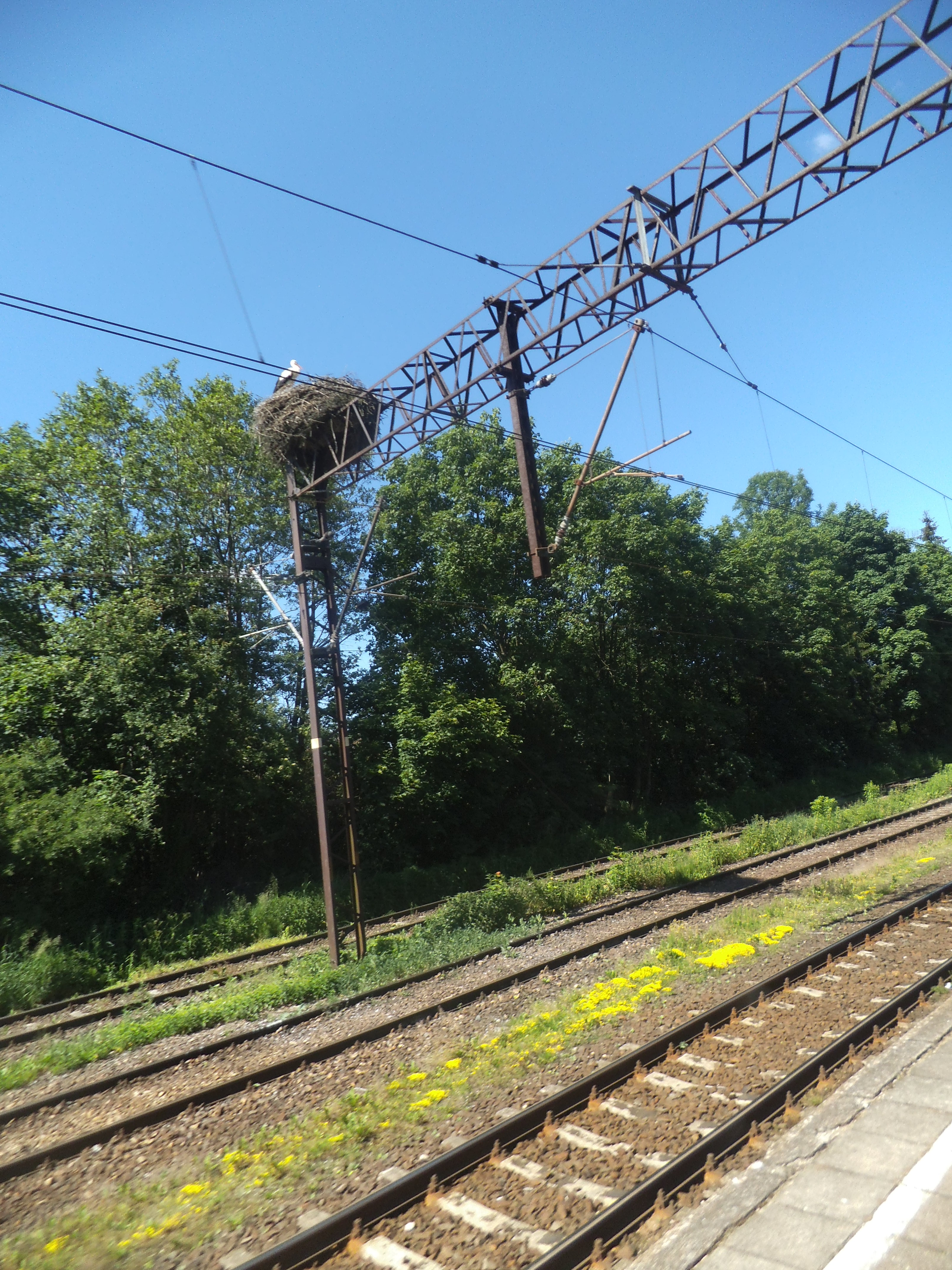 A koła wagonu turkoczą, słonko przez okno (ze smugami brudu) zagląda, w przedziale pusto. Komputer włączony, tylko o czym tym razem napisać? Zacznę chyba od bociana, który założył gniazdo na słupie trakcji elektrycznej. Zobaczyłem tę konstrukcję jadąc rankiem w tamtą stronę, przypilnowałem wracając i w pędzie, przez otwarte okno, zrobiłem zdjęcie. Pani Kasiu, to będzie mój debiut fotograficzny w niewątpliwie poczytnym miesięczniku przez Panią redagowanym.