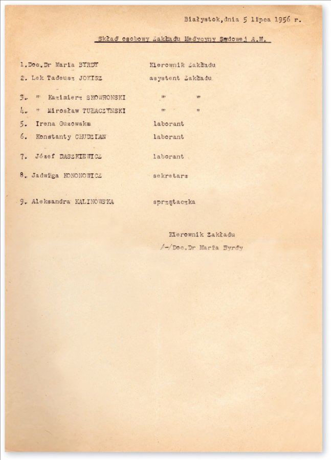 Katedra Medycyny Sądowej w Białymstoku została powołana do życia 1 września 1954 r., a pierwszym jej Kierownikiem została doc. dr Maria Byrdy (zdj. 1). Z materiałów archiwalnych wiadomo, że Minister Zdrowia J. Sztachelski powołał dr Marię Byrdy z dniem 1.09.1954 r. „na czas nieokreślony do pełnienia funkcji samodzielnego pracownika nauki przy Katedrze Medycyny Sądowej Akademii w Białymstoku, w pełnym wymiarze godzin profesorskich, wraz z kierownictwem Zakładu przywiązanego do tej Katedry”. JM Rektor Akademii Medycznej w Białymstoku prof. T. Kielanowski podjął starania o zorganizowanie Katedry już w marcu 1954 r.. Prof. B. Popielski (ówczesny Kierownik Zakładu Medycyny Sądowej we Wrocławiu) polecił Rektorowi AMB ewentualną kandydatkę na kierownika Zakładu w Białymstoku w osobie doc. dr M. Byrdy. W listopadzie 1954 r. Zakład Medycyny Sądowej, mieszczący się w budynku przy ul. Mickiewicza 2, przejął 7 pomieszczeń od Zakładu Chemii Ogólnej, a z sutereny Zakładu Anatomii Prawidłowej wydzielono salę sekcyjną i miejsce na komorę na zwłoki oraz odczynniki i paszę dla zwierząt. Pierwszym asystentem i późniejszym długoletnim współpracownikiem Zakładu był dr T. Jokisz (zdj. 2).